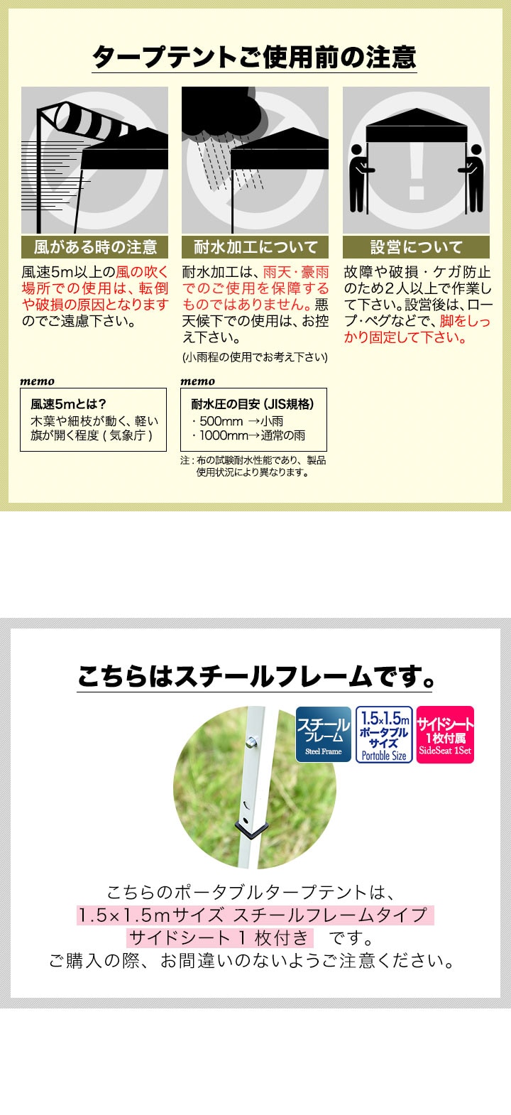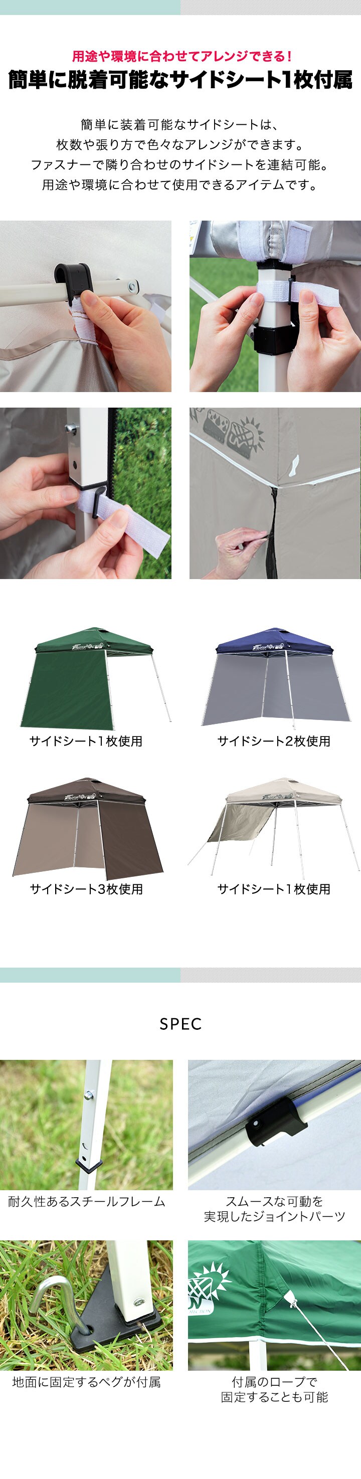 | 付属品: ・専用サイドシート(1枚) ・ロープ ・ペグ ・専用収納ケース ・取扱説明書(日本語) |