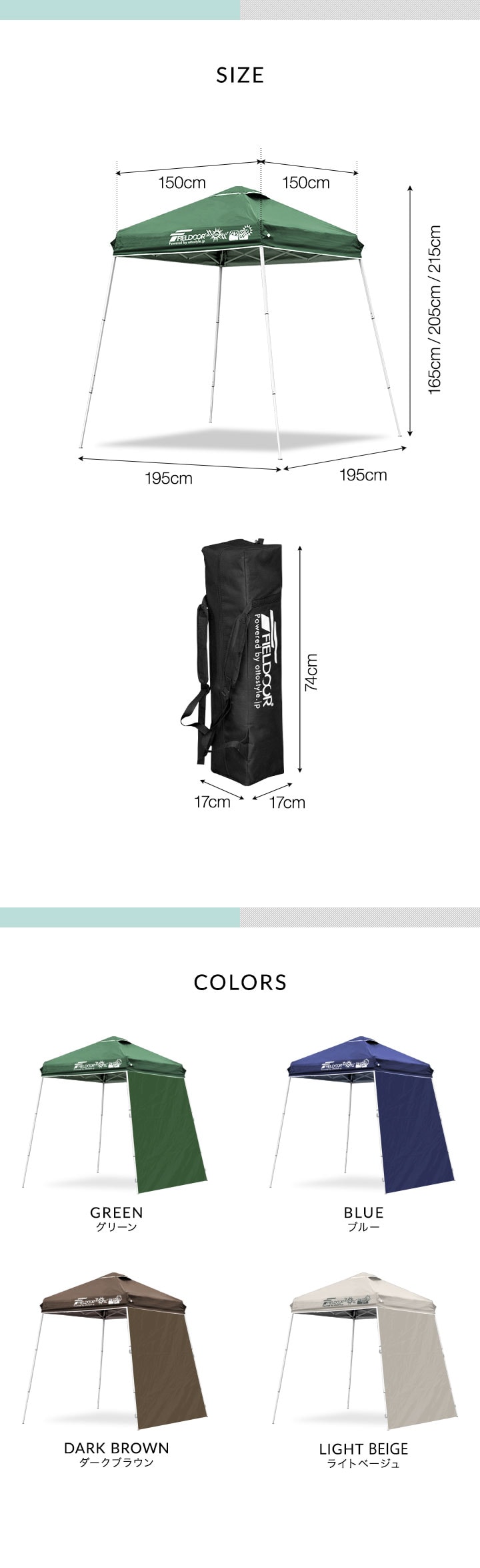 | サイズ: 組立時 : (約)1.95m×1.95m×2.15m ※最大寸法 収納時 : (約)17cm×17cm×74cm |