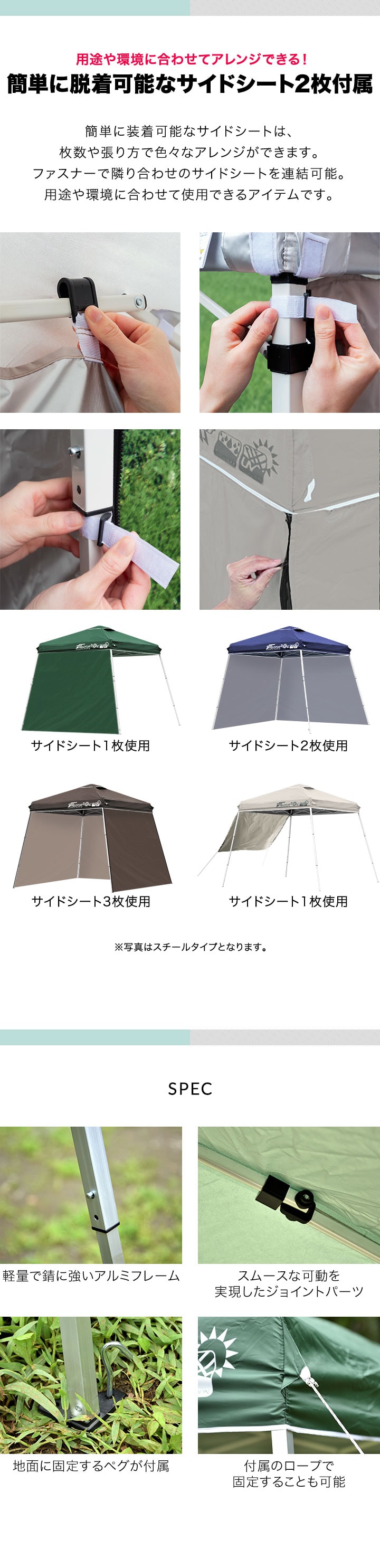 | 付属品: ・専用サイドシート(2枚) ・ロープ ・ペグ ・専用収納ケース ・取扱説明書(日本語) |