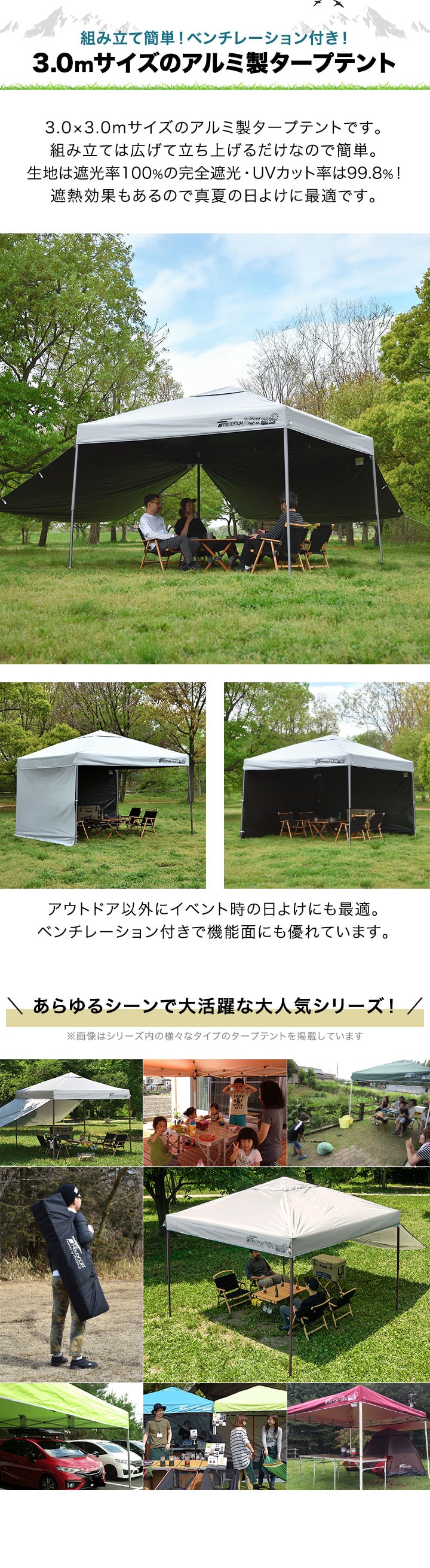 FIELDOOR ワンタッチタープテント 3m (遮光遮熱PU:グレー/アルミ/強化版サイドフレーム/4点脚ロック/タープ本体のみ/サイドシート2枚付) 軽量 テント タープ ワンタッチテント ワンタッチタープ UV加工 撥水 ベンチレーション 収納バッグ付 日よけ キャンプ 送料無料