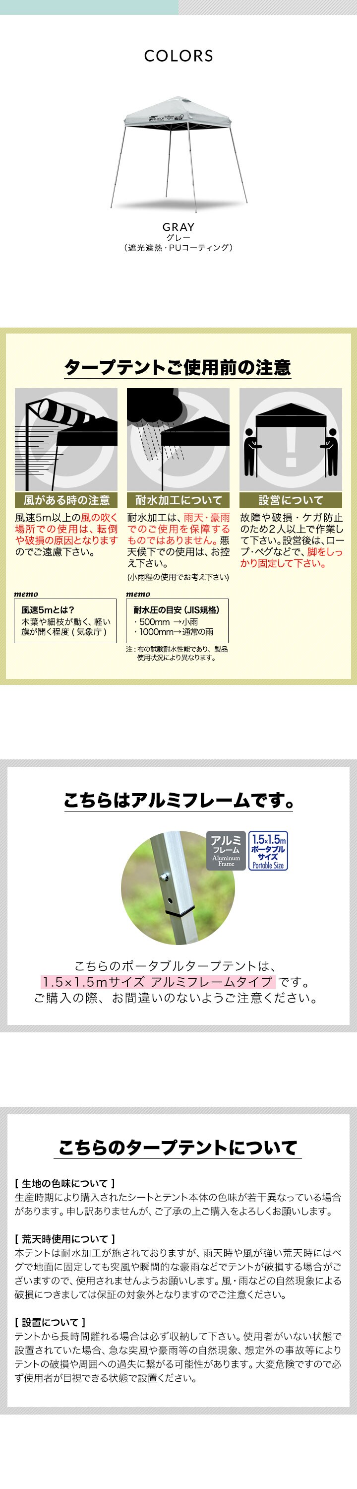 FIELDOOR ポータブルタープ 1.5m×1.5m (遮熱遮光PU:グレー/アルミ/センターロック/タープ本体のみ) タープ テント 頑丈 アルミ 150cm コンパクト 収納 小型 持ち運び 簡単 設営 ワンタッチタープ ワンタッチテント UV加工 撥水 アウトドア キャンプ 送料無料