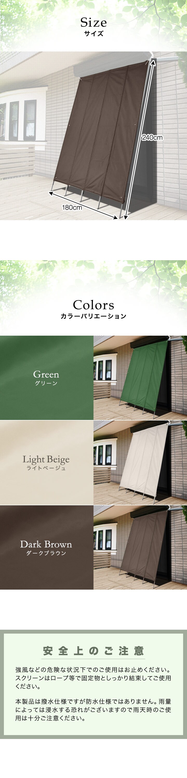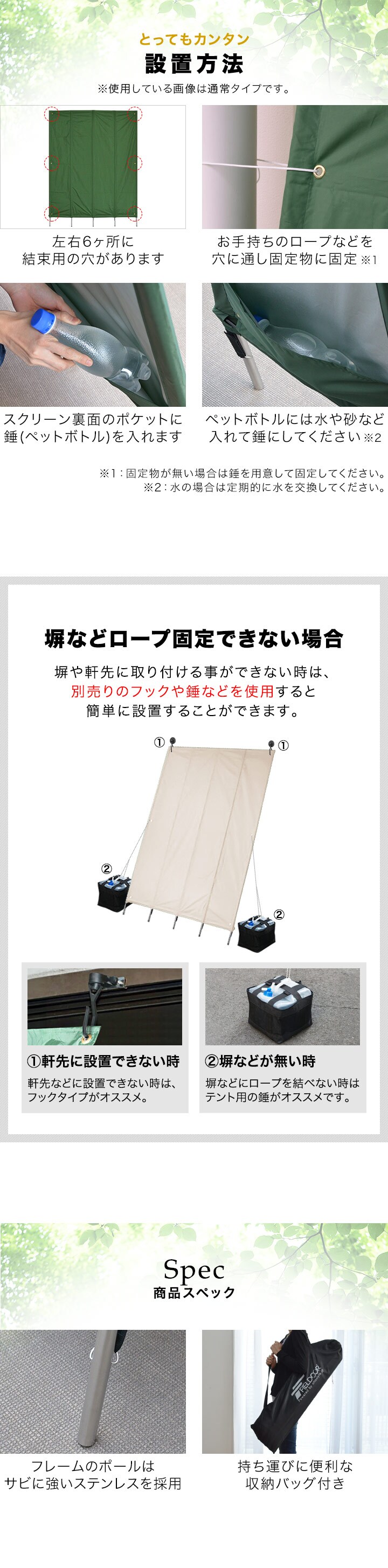 | 特記事項: ※こちらの商品にはロープ・錘は付属いたしません。 ※日よけスクリーンの設置は、必ず固定物と固定、もしくは錘で固定してください。 ※設置は安全のため2人以上で行ってください。 |