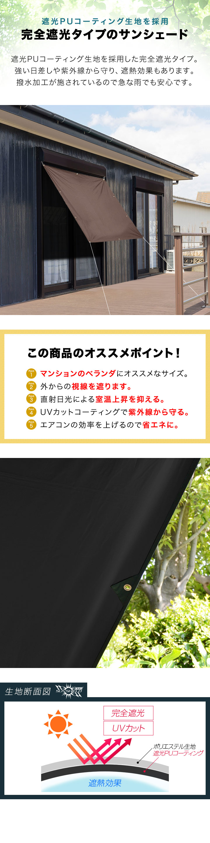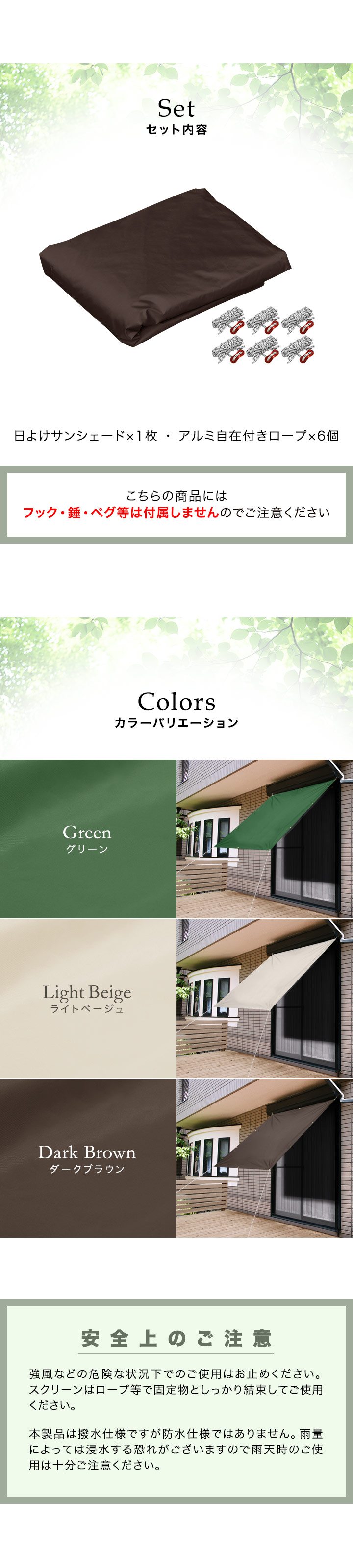 | 特記事項: ※こちらの商品には錘は付属いたしません。 ※日よけサンシェードの設置は、必ず固定物と固定、もしくは錘で固定してください。 ※設置は安全のため2人以上で行ってください。 |