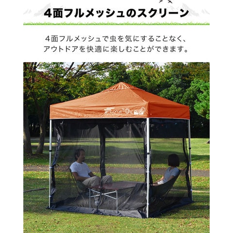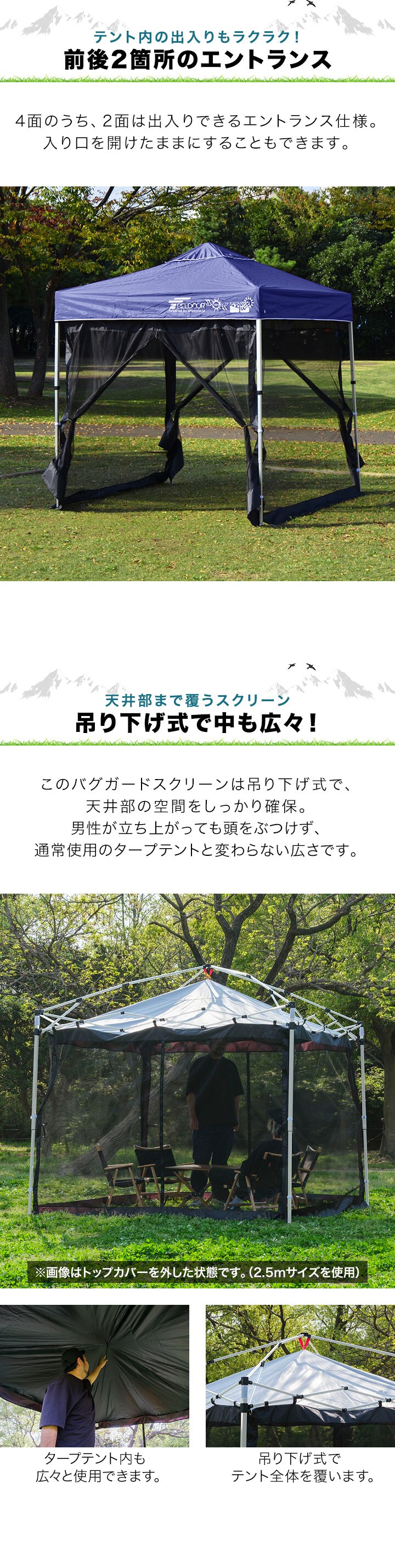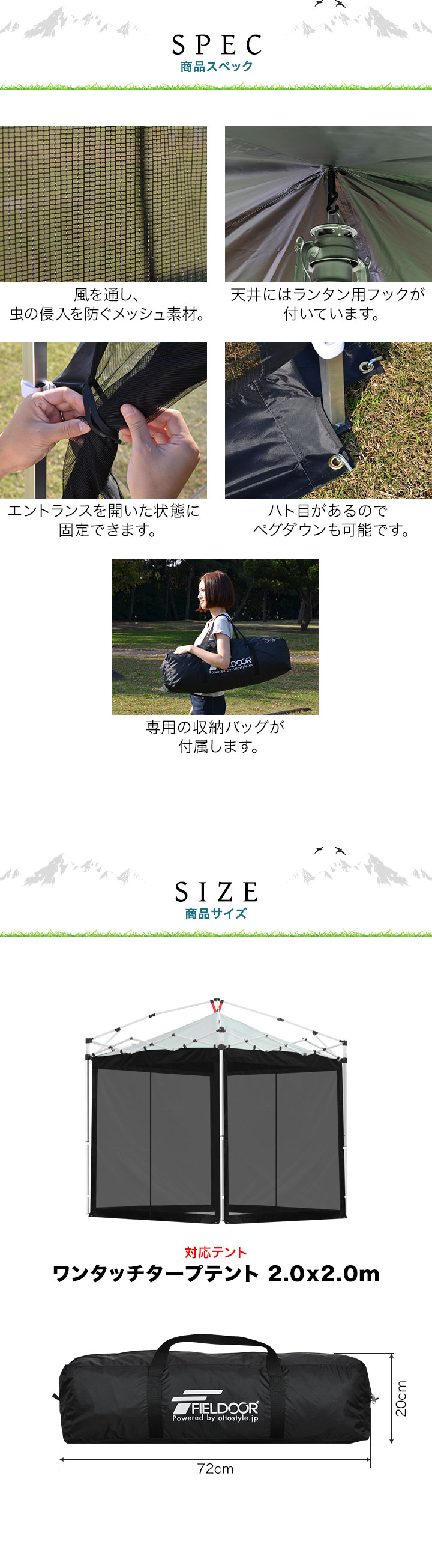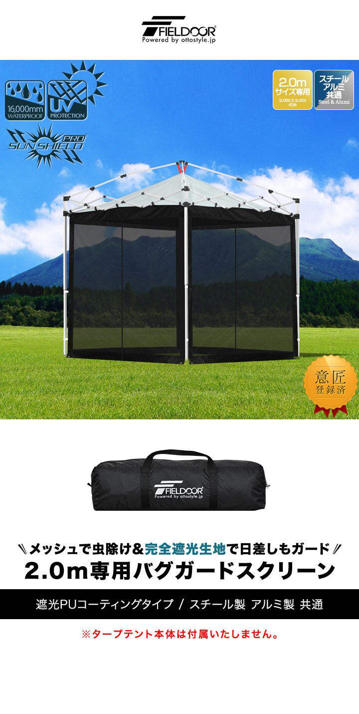 FIELDOOR ワンタッチタープテント用 横幕 サイドシート 2m 2.0m 200cmサイズ バグガードスクリーン 天面遮光/遮熱コーティング 4面 吊り下げ 蚊帳 メッシュ 虫よけサイドシート 虫よけ 網 オプション