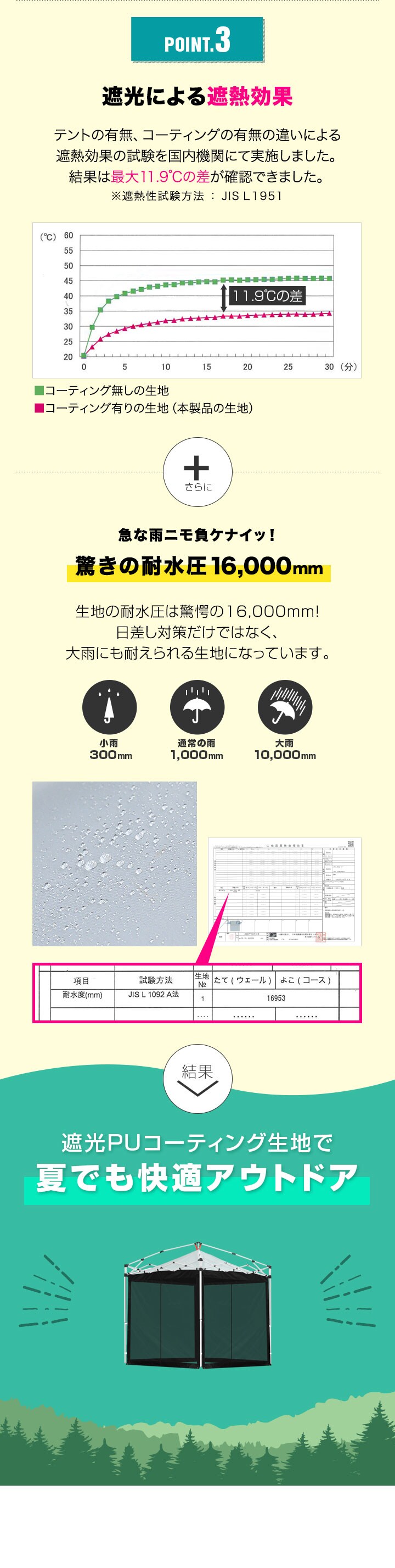 | 耐水圧: 16,000mm ※耐水圧は生地のスペックとしての数値であり、雨の日にトップカバー無しの単体で使用することを想定したものではありません。 |