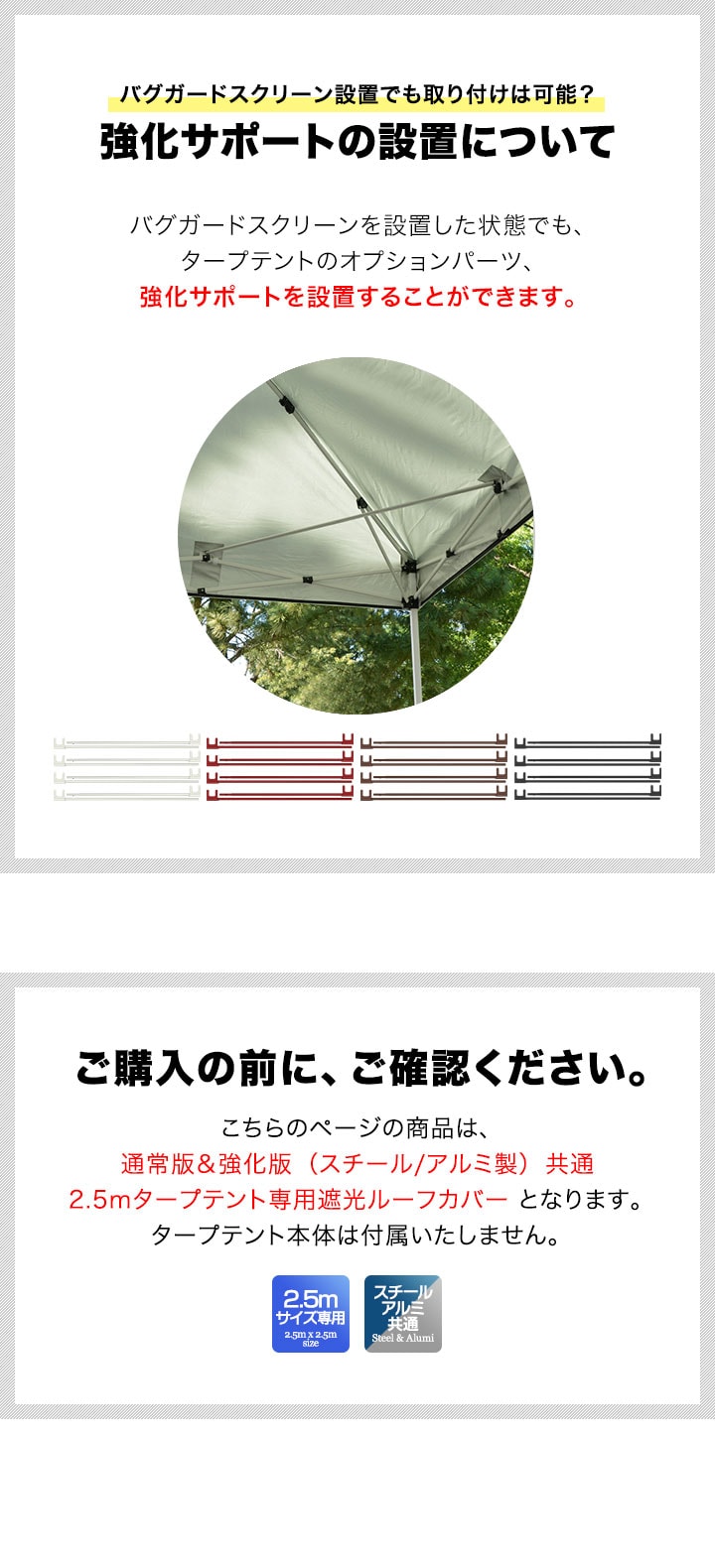 | サイズ: 2.5m×2.5m タープテント専用(スチール製・アルミ製共通) 他社メーカーの製品: ・モダンデコ : AND・DECO 2.5×2.5m など ※モダンデコはモダンデコ株式会社の登録商標です。 ※AND・DECOはモダンデコ株式会社の登録商標です。 |