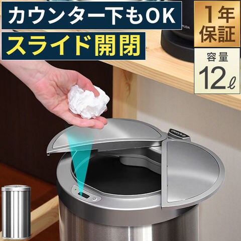 ゴミ箱 自動開閉 スリム ふた付き 12L 人感センサー 横開き スライド開閉 幅24.5cm×高さ44cm ステンレス 丸形 センサー開閉 電池 電動 ペダルいらず ダストボックス ペール 衛生 防臭 キッチン リビング 小さい 20Lゴミ袋対応 送料無料