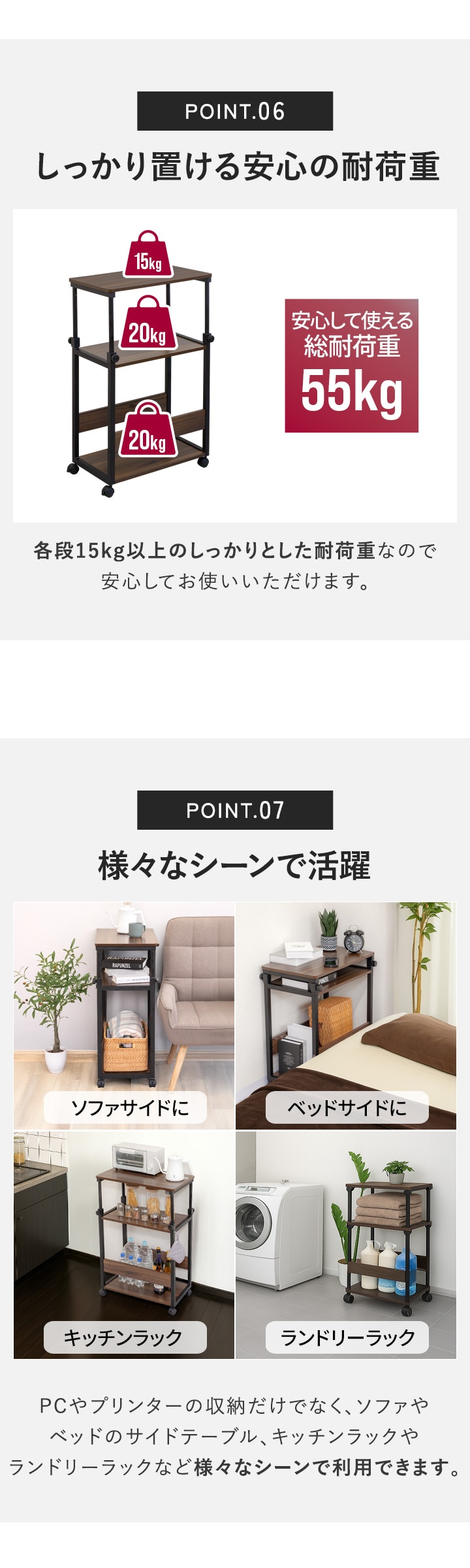 | 耐荷重: ・天板:15kg ・中段:20kg ・下段:20kg ・全体の耐荷重:55kg |