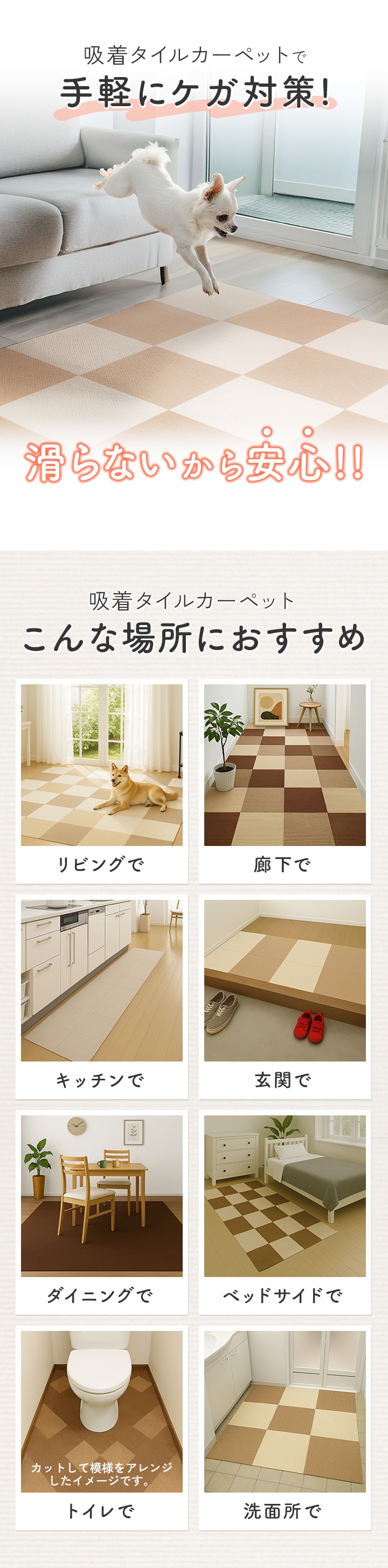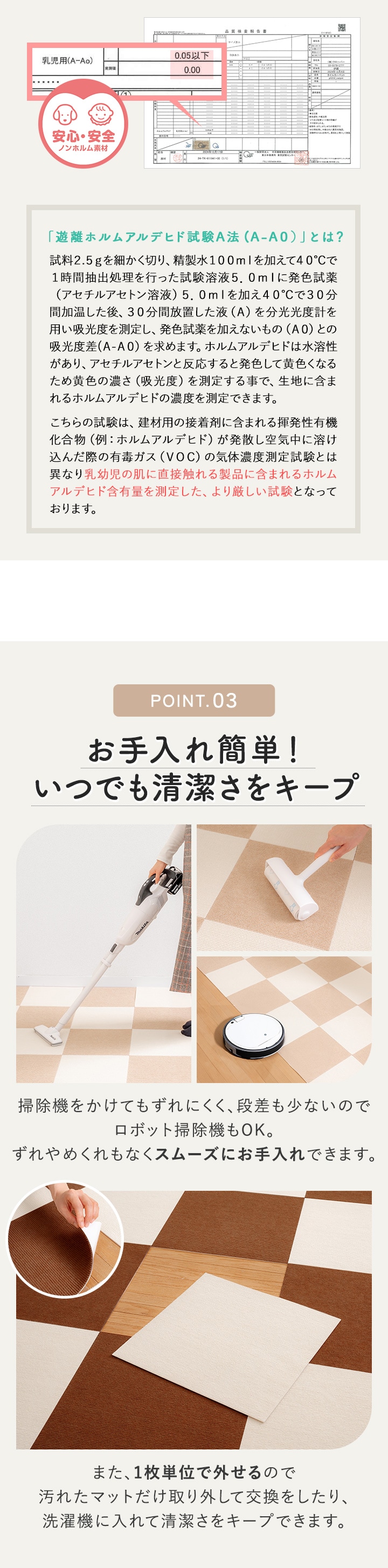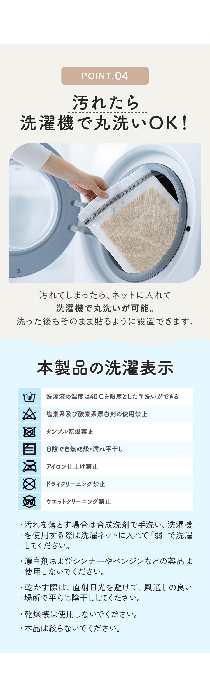 | 特記事項: ・当マットが浮き上がっていたり、ずれていたりするとすべる場合があります。 床面にしっかりと吸着していることをご確認の上ご使用ください。 ・アイロンは使用できません。 ・床暖房環境でご使用になる場合は、床面温度が40度を超えないようにご注意ください。 ・吸着面同士を合わせたまま長時間放置すると離れなくなる場合があります。 ・無垢材を使用した床、老朽化した床や、畳、カーペット・絨毯の上では使用しないでください。 ・長時間敷き詰めたままにしておくと剥がしにくくなる場合があります。 1週間に一度は床から一旦剥がして、風通しのよい場所に置いてください。 ・吸着面が剥がれにくくなった場合はゆっくりと剥がしてください。万一剥がれない場合や、貼り付け跡が床に付着した場合は、ぬるま湯で濡らせた布で拭き取ってください。 ・マットを剥がした後、敷いてあった部分がすべり易くなる場合があります。その場合は中性洗剤をうすめた水を浸した布でよく拭きとってください。 ・洗って繰り返し使用が可能ですが、吸着力が弱くなってきたら、安全のため使用を中止し、新しいものにお買い替えください。 |