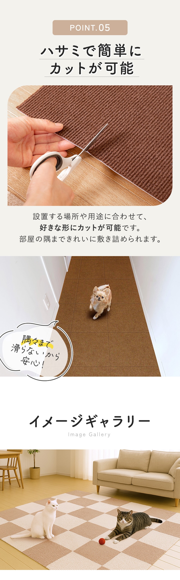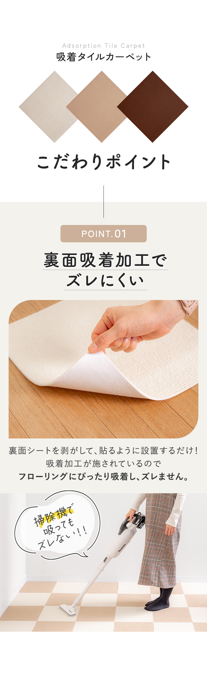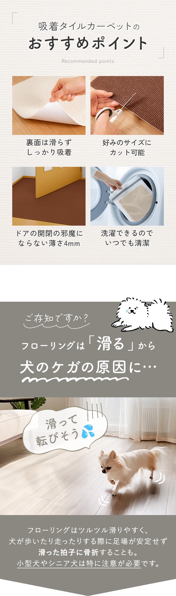 | 特記事項: ・当マットが浮き上がっていたり、ずれていたりするとすべる場合があります。 床面にしっかりと吸着していることをご確認の上ご使用ください。 ・アイロンは使用できません。 ・床暖房環境でご使用になる場合は、床面温度が40度を超えないようにご注意ください。 ・吸着面同士を合わせたまま長時間放置すると離れなくなる場合があります。 ・無垢材を使用した床、老朽化した床や、畳、カーペット・絨毯の上では使用しないでください。 ・長時間敷き詰めたままにしておくと剥がしにくくなる場合があります。 1週間に一度は床から一旦剥がして、風通しのよい場所に置いてください。 ・吸着面が剥がれにくくなった場合はゆっくりと剥がしてください。万一剥がれない場合や、貼り付け跡が床に付着した場合は、ぬるま湯で濡らせた布で拭き取ってください。 ・マットを剥がした後、敷いてあった部分がすべり易くなる場合があります。その場合は中性洗剤をうすめた水を浸した布でよく拭きとってください。 ・洗って繰り返し使用が可能ですが、吸着力が弱くなってきたら、安全のため使用を中止し、新しいものにお買い替えください。 |