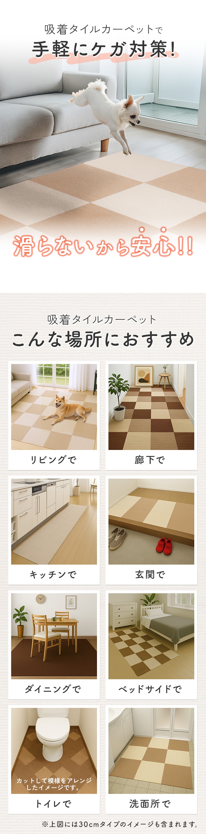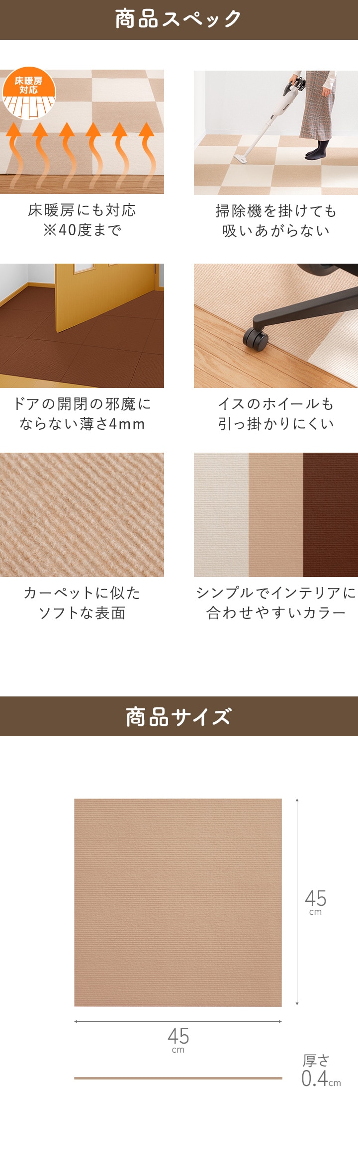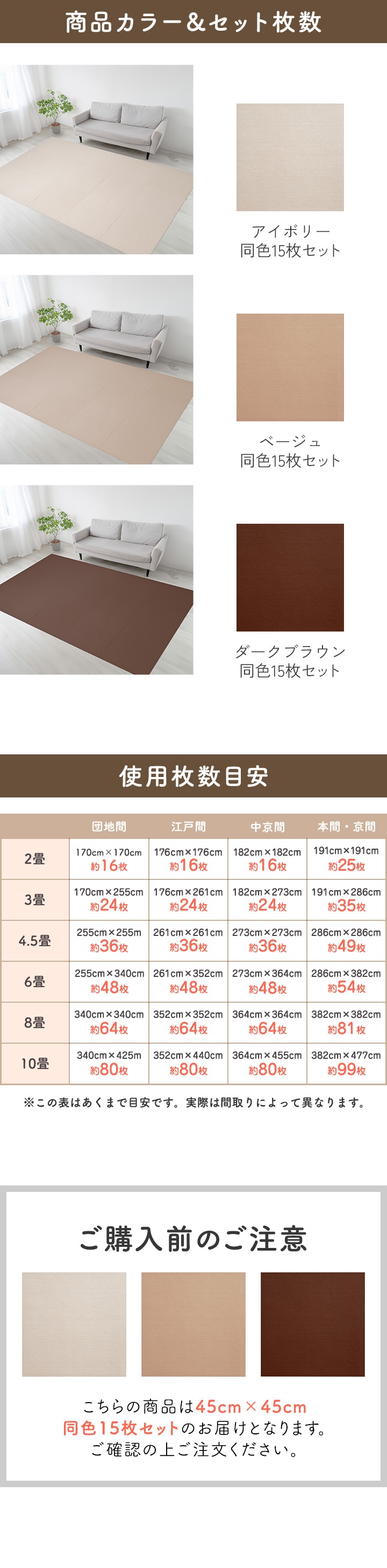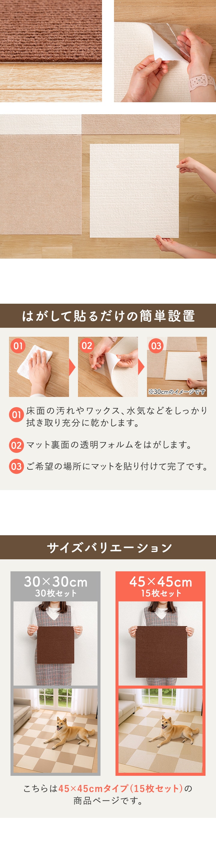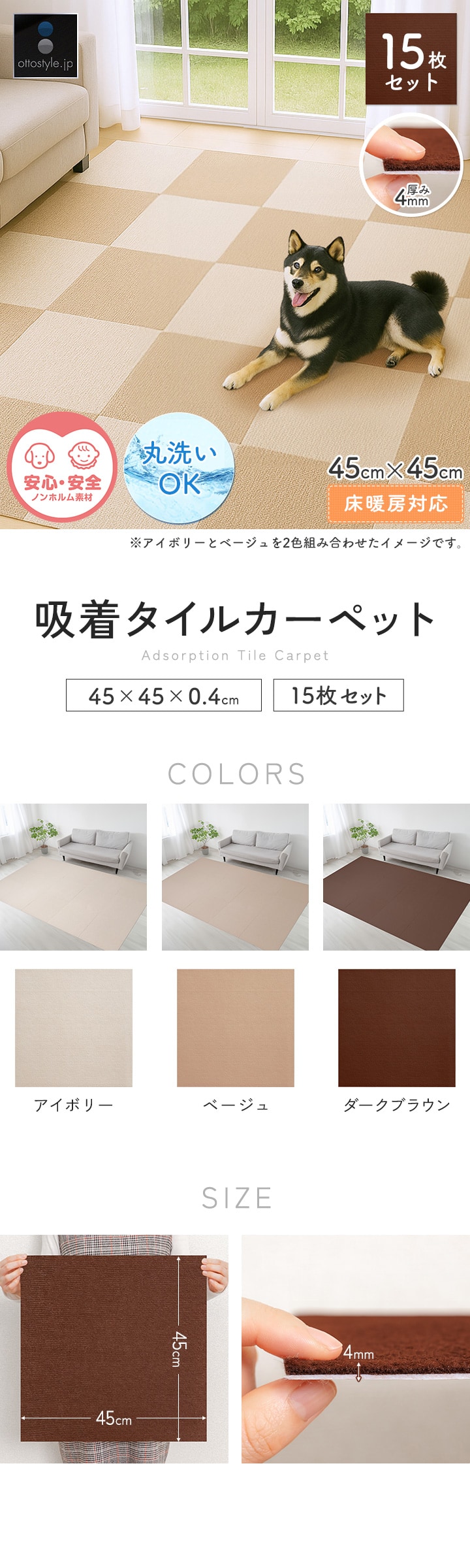 タイルカーペット 45×45cm/厚み4mm 吸着 (ベージュ15枚組) タイルマット 洗濯機で洗える 床暖房対応 滑り止め フロアカーペット 子供 犬 猫 ペット 正方形 ジョイントマット 無地 ファブリックフロア ズレない 滑らない 足音対策 送料無料