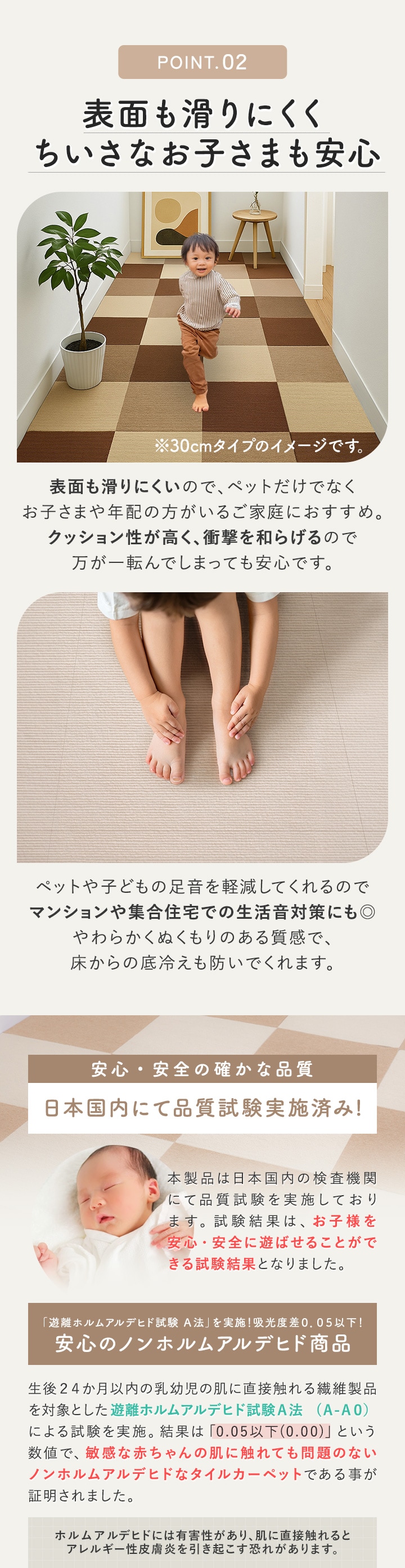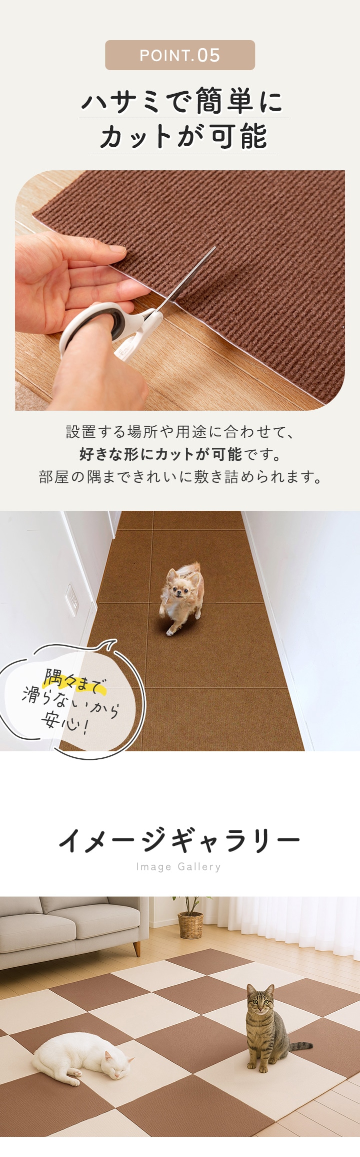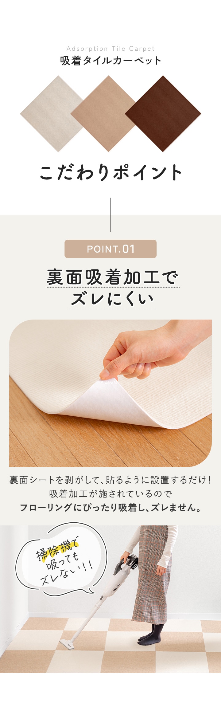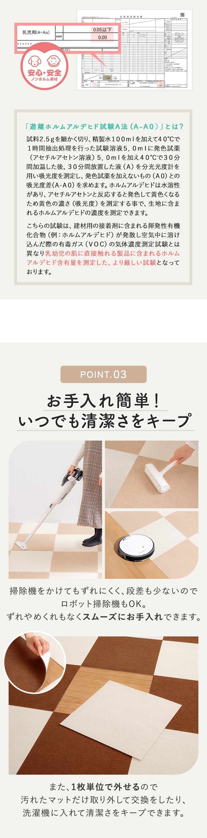 ・長時間敷き詰めたままにしておくと剥がしにくくなる場合があります。 1週間に一度は床から一旦剥がして、風通しのよい場所に置いてください。