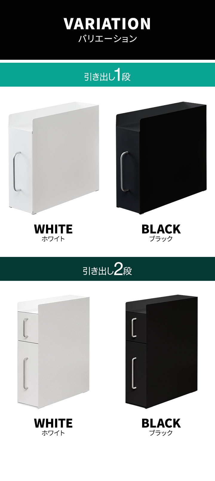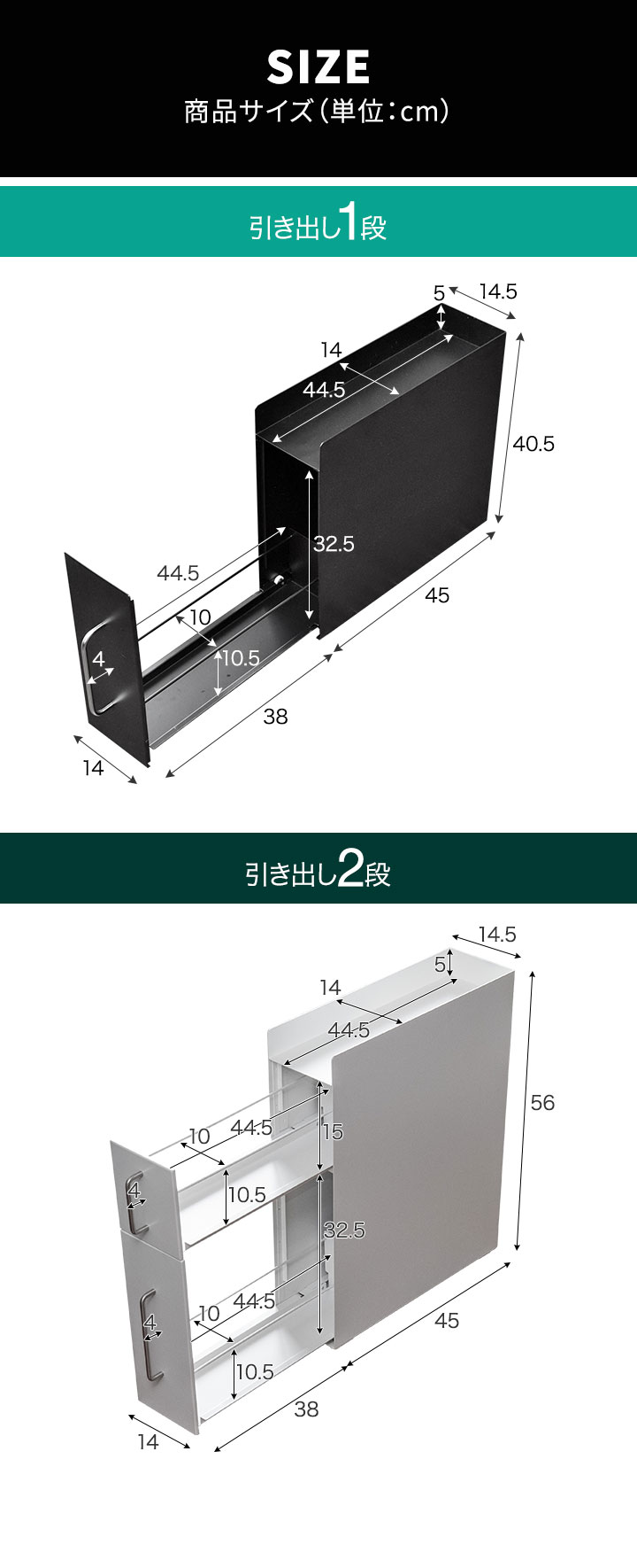 | サイズ(内寸): 引き出し下段 : (約)幅10cm×奥行44.5cm×高さ32.5cm 引き出し上段 : (約)幅10cm×奥行44.5cm×高さ15cm 天板 : (約)幅14cm×奥行44.5cm×高さ5cm |