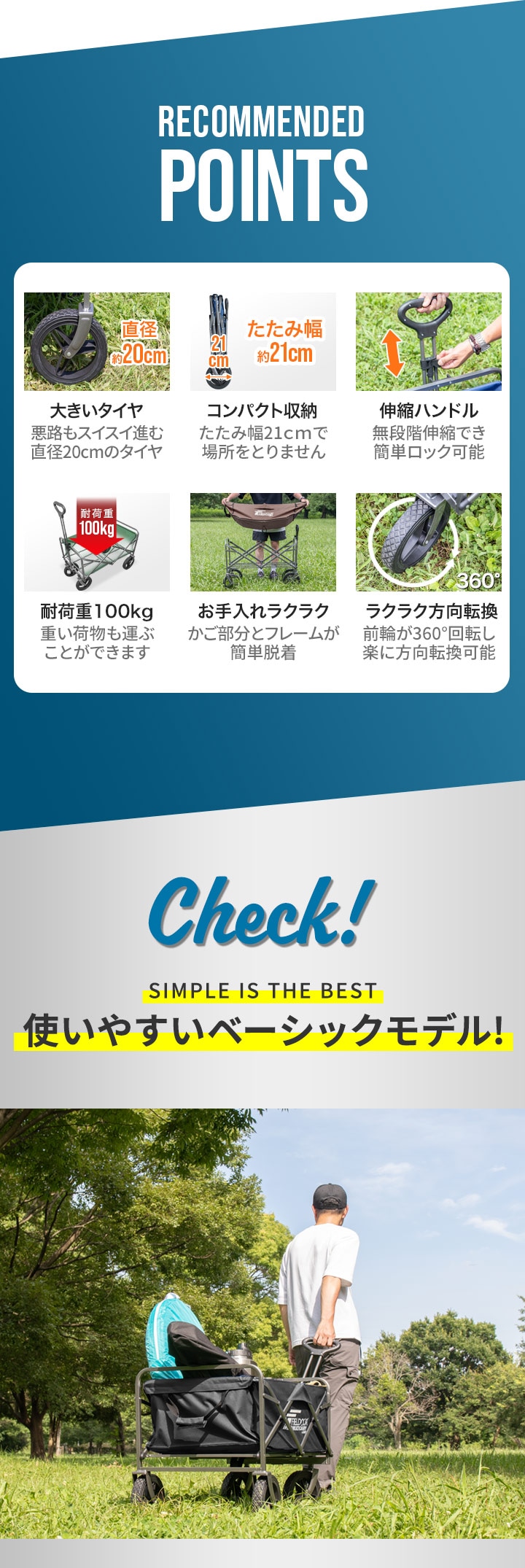 | サイズ: ・本体 : (約)長さ99cm×幅54cm×高さ76~103cm ・かごの寸法 : (約)長さ76cm×幅46cm×深さ27cm ・折りたたみ時 : (約)長さ54cm×幅40cm×高さ75cm |