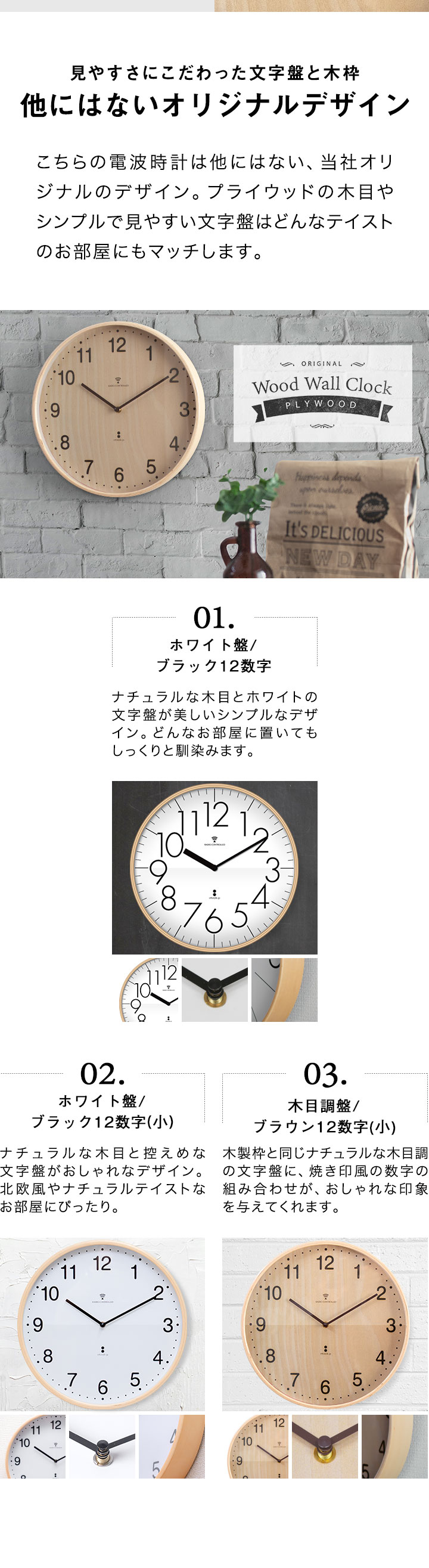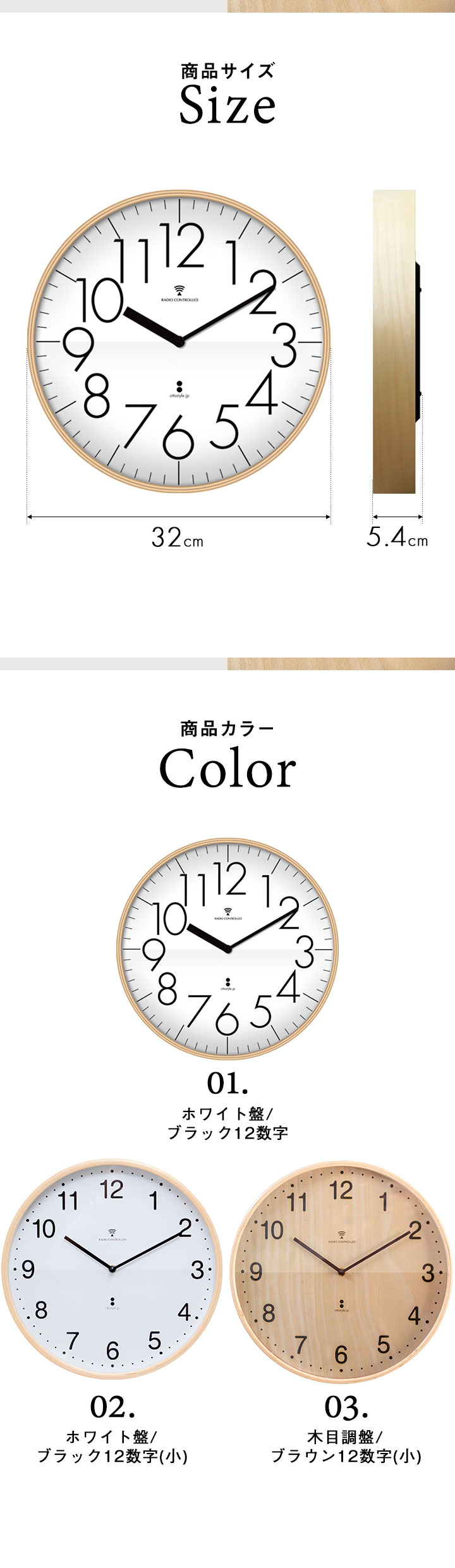 | カラー: ・[01]【ホワイト盤 / ブラック12数字】 ・[02]【ホワイト盤 / ブラック12数字(小)】 ・[03]【木目調盤 / ブラウン12数字(小)】 |