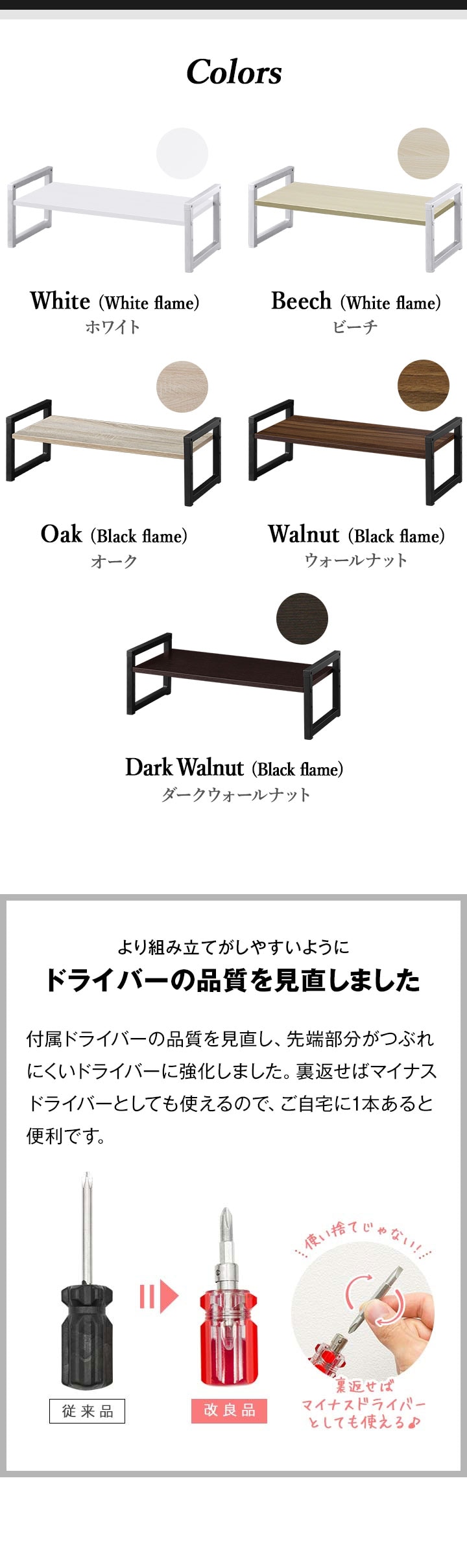 | カラー: ・ホワイト (ホワイトフレーム) ・ビーチ (ホワイトフレーム) ・オーク (ブラックフレーム) ・ウォールナット (ブラックフレーム) ・ダークウォールナット (ブラックフレーム) |