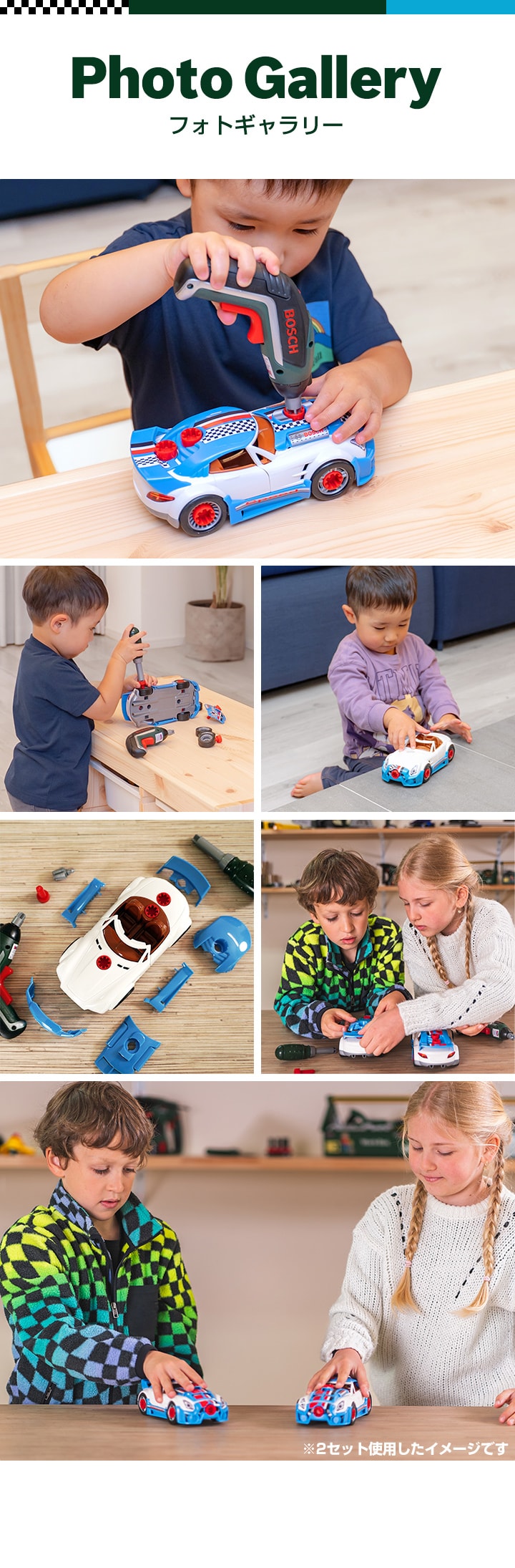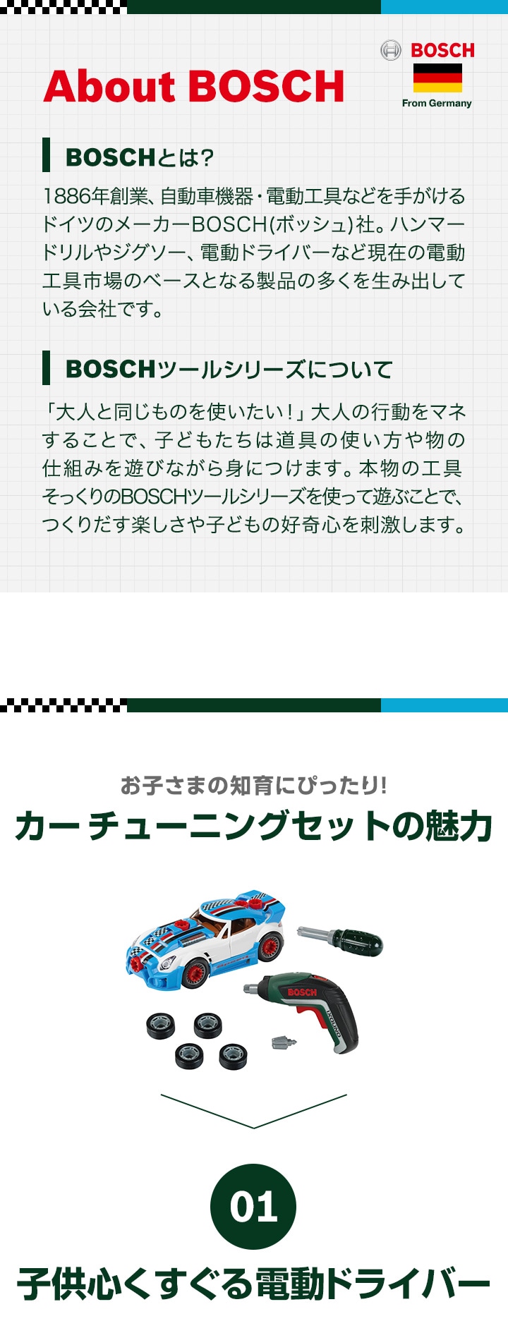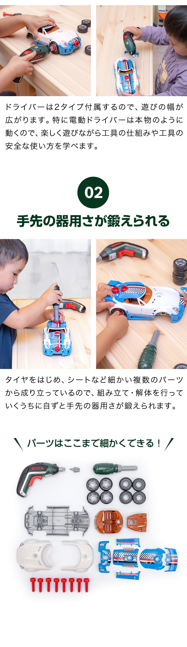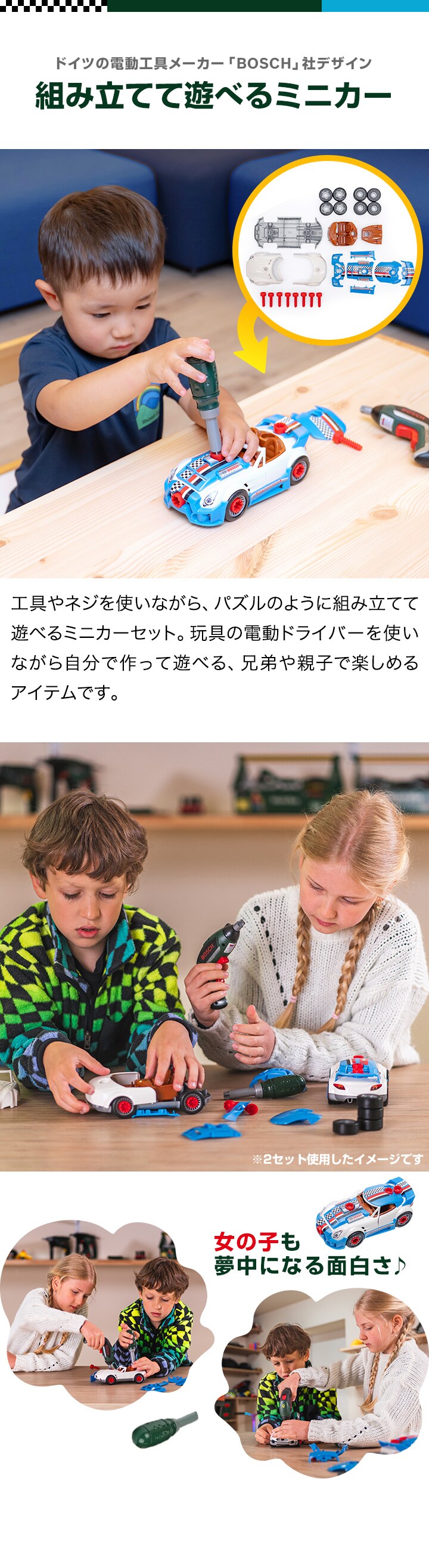 おもちゃ 車 ミニカー BOSCH ボッシュ 組み立て 大工さん 知育玩具 ままごと 工具セット カーメンテナンスキット 電動ドライバー ドリル ネジ ごっこ遊び DIY 工具 分解 まねごと 誕生日 幼児 子供 3歳~ 男の子 プレゼント 送料無料