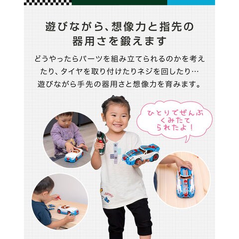 | 重量: ・車本体…(約)190g ・その他…(約)130g ※総重量…(約)320g ※その他内訳:補助用タイヤ4個/電動ドライバー(替え芯含む)/ドライバー ※電動ドライバーの乾電池を含まない重量となります。 |