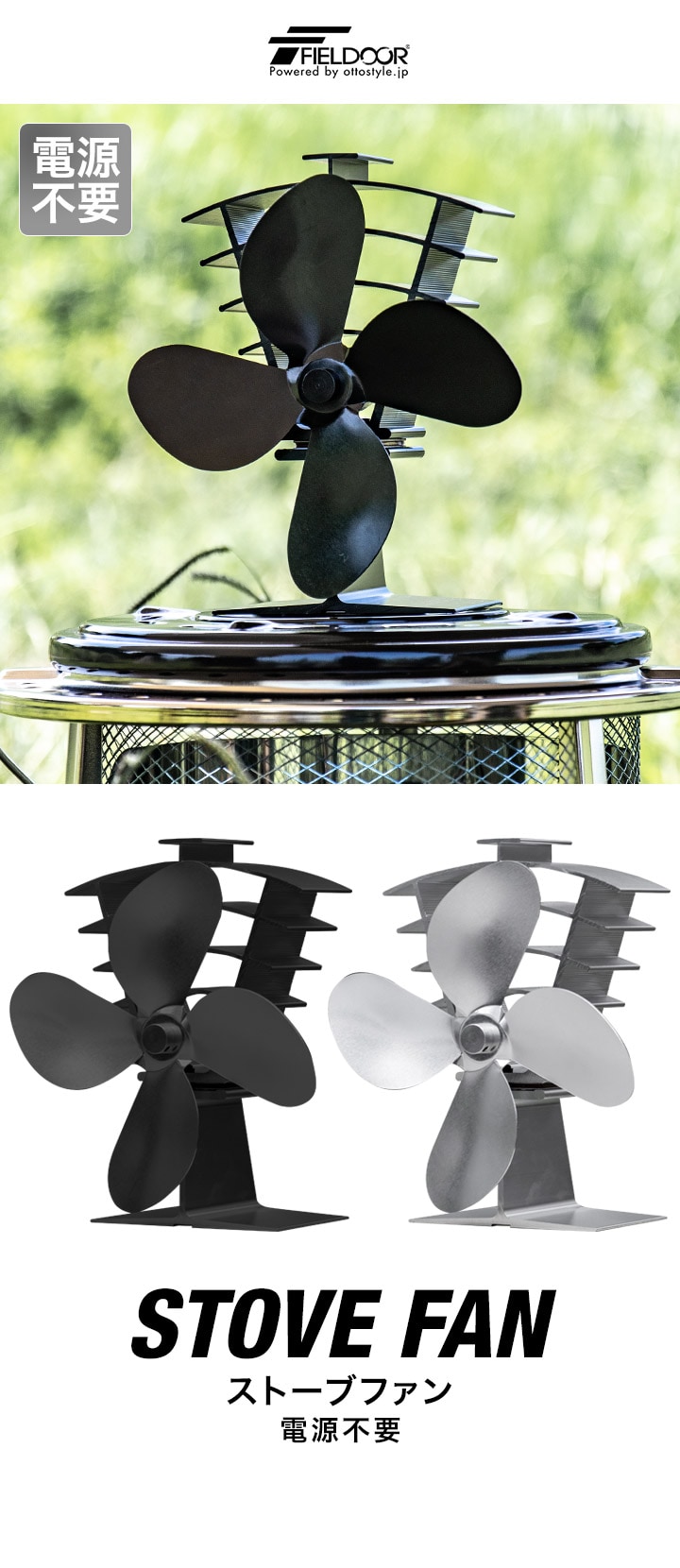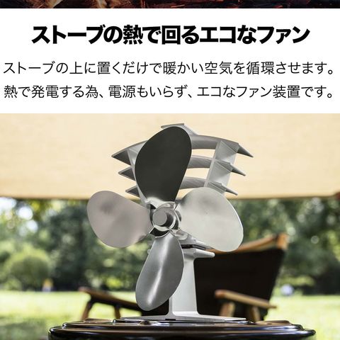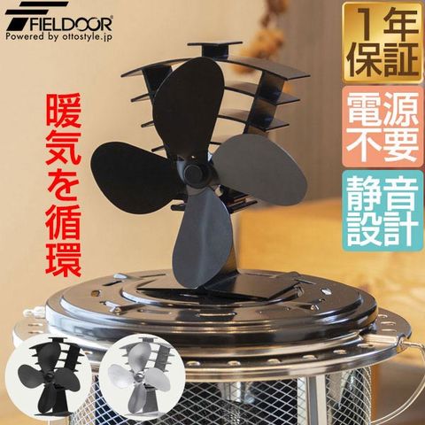 FIELDOOR ストーブファン 4枚羽根 (シルバー/本体&収納ケースセット) 直径約18cm エコ 電源不要 省エネ 薪ストーブ 石油ストーブ 灯油ストーブ ガスストーブ 安心安全 加熱保護プレート付き 静音 空気循環 暖房 エコストーブファン 火力熱炉ファン アウトドア 送料無料