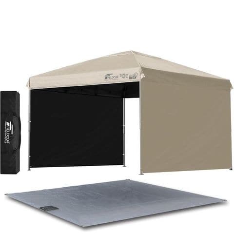 FIELDOOR ワンタッチタープテント 3m (遮光遮熱PU:ライトベージュ/アルミ/4点脚ロック/グランドシート/サイドシート2枚付) 軽量 テント タープ ワンタッチ ワンタッチテント ワンタッチタープ UV加工 撥水 ベンチレーション 収納バッグ付 日よけ キャンプ 送料無料