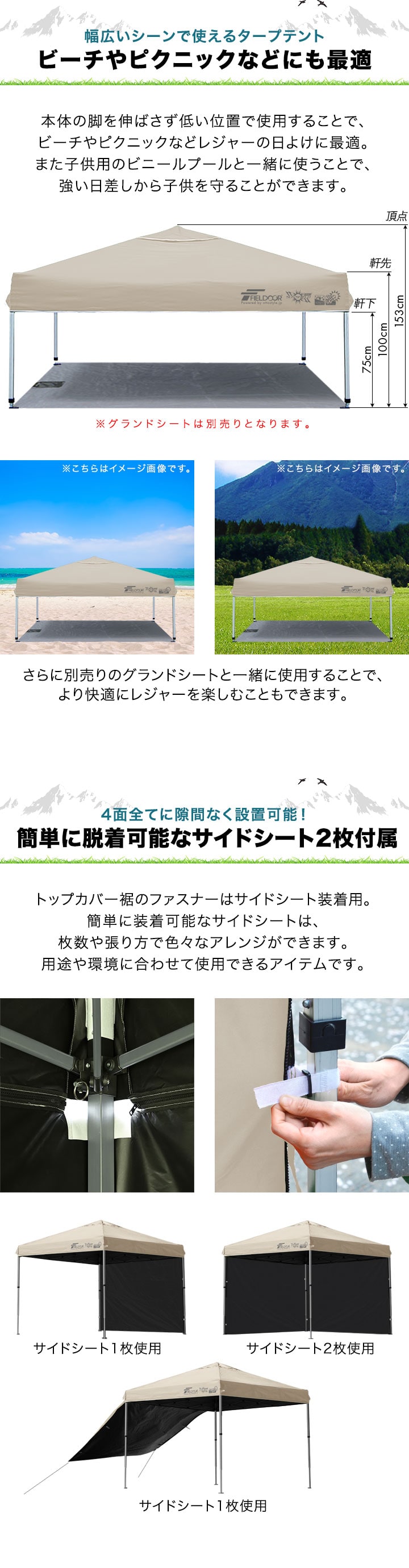 FIELDOOR ワンタッチタープテント 2.5m (遮光遮熱PU:ライトベージュ/アルミ/4点脚ロック/ウエイト4点組み/サイドシート2枚付) 軽量 テント タープ ワンタッチテント ワンタッチタープ UV加工 撥水 ベンチレーション 収納バッグ付 日よけ キャンプ 送料無料