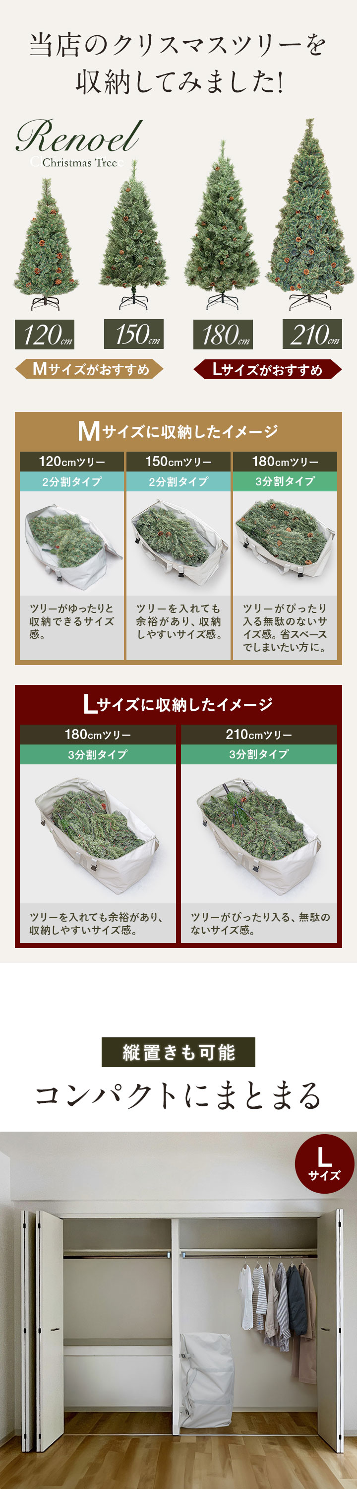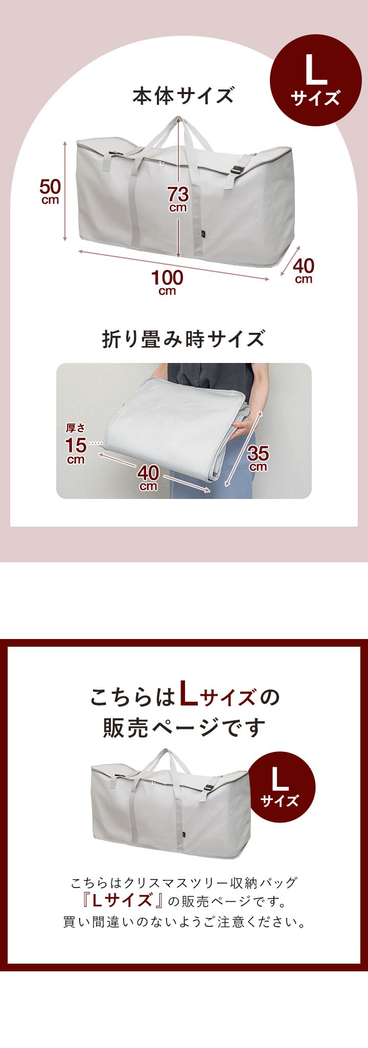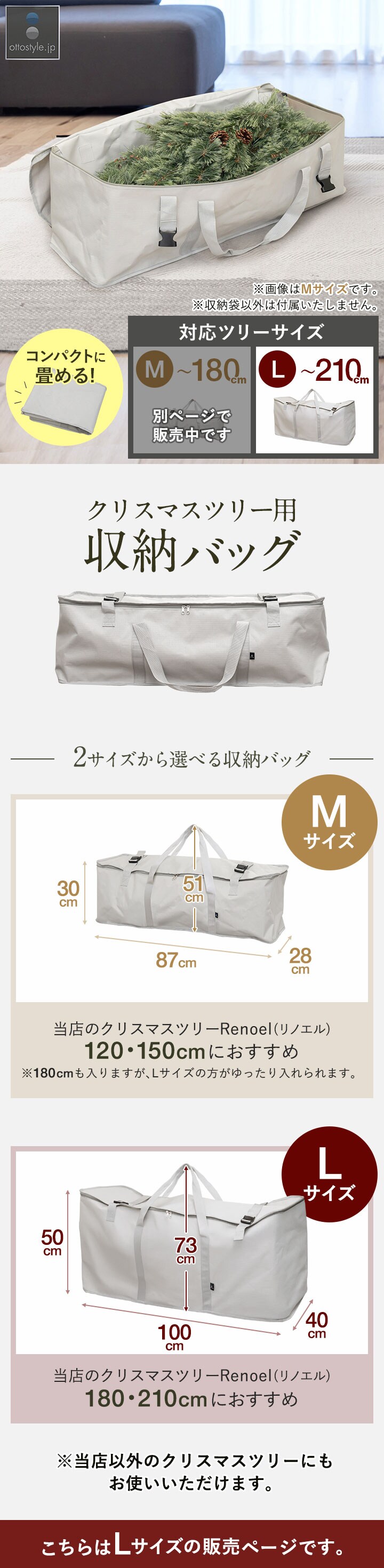 | 特記事項: ※こちらはLサイズの販売ページです。 ※当店以外のクリスマスツリーを収納する事もできますが、ご購入前にお持ちのツリーをお客様自身で計測の上、ご購入ください。 ※クリスマスツリー用の収納バッグとなりますので、オーナメントなどの飾り等は別でご収納ください。 ※クリスマスツリーを収納する際は、広がった枝葉をできるだけコンパクトにまとめた上で収納してください。 ※押し込むような収納は、変形や破損の原因になる可能性があるのでご注意ください。 |