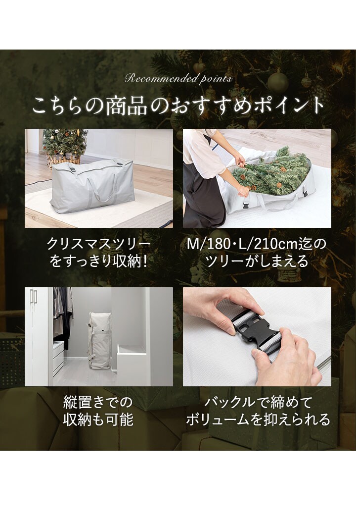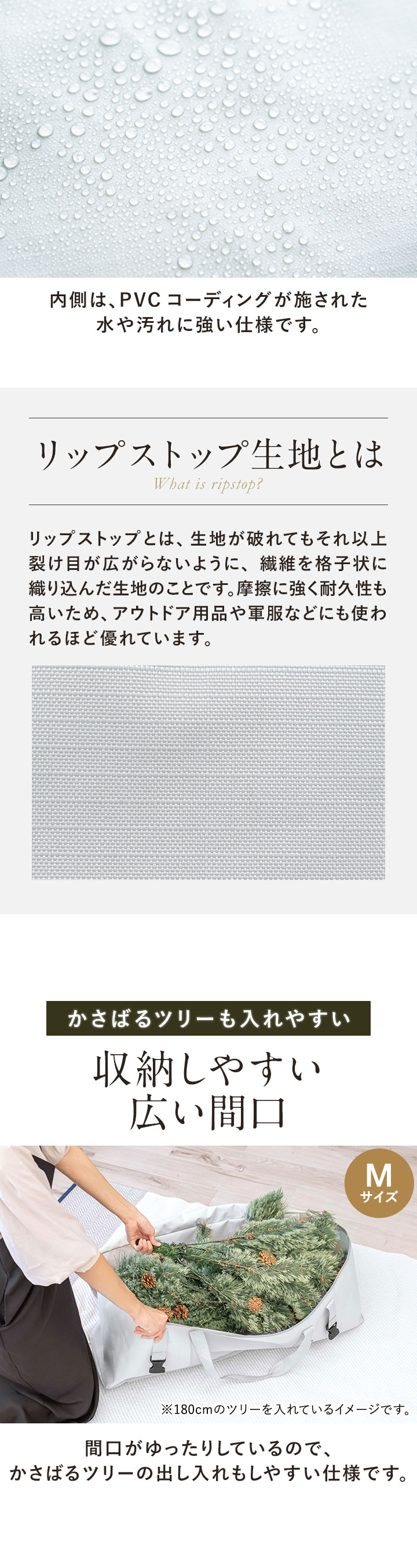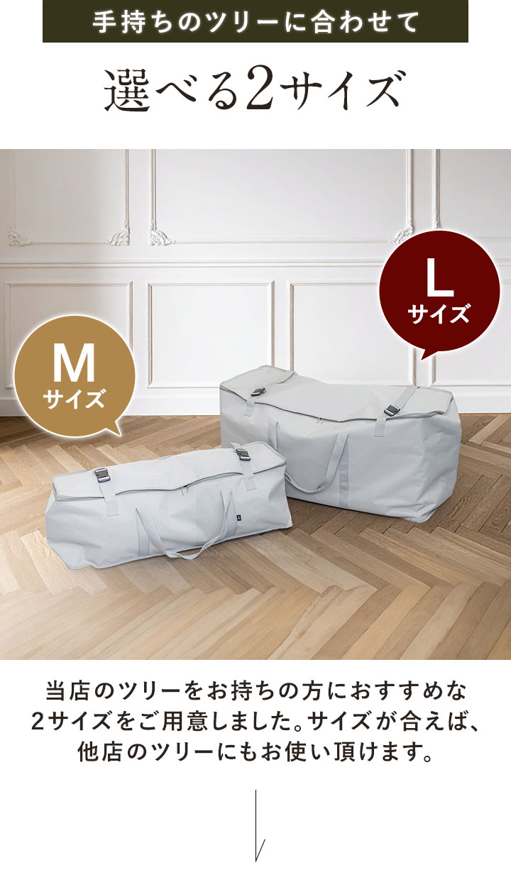 | 特記事項: ※こちらはLサイズの販売ページです。 ※当店以外のクリスマスツリーを収納する事もできますが、ご購入前にお持ちのツリーをお客様自身で計測の上、ご購入ください。 ※クリスマスツリー用の収納バッグとなりますので、オーナメントなどの飾り等は別でご収納ください。 ※クリスマスツリーを収納する際は、広がった枝葉をできるだけコンパクトにまとめた上で収納してください。 ※押し込むような収納は、変形や破損の原因になる可能性があるのでご注意ください。 |