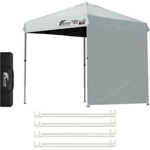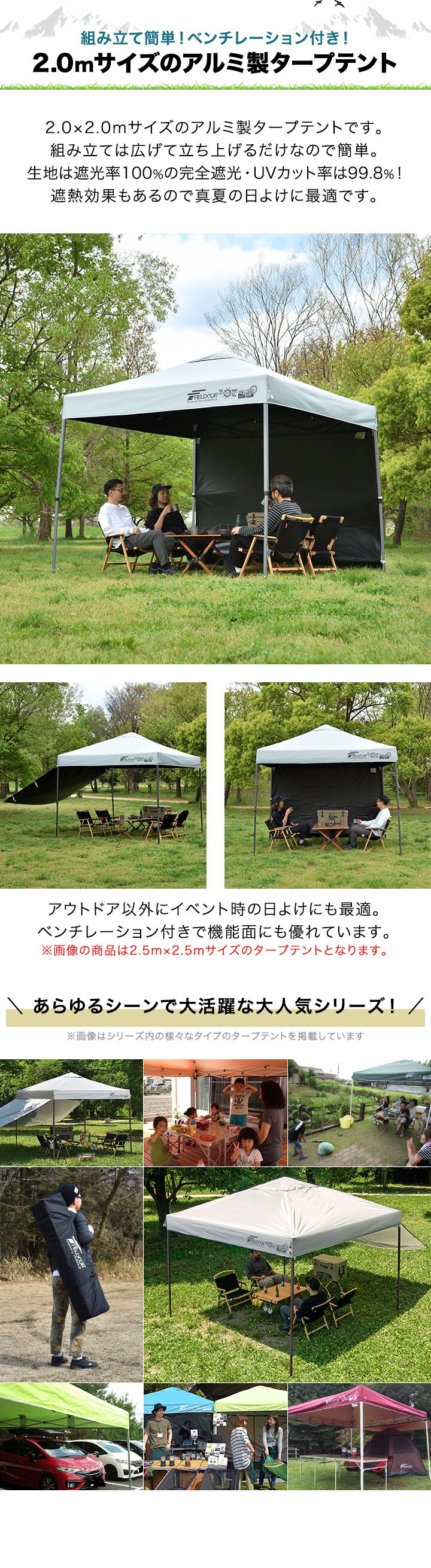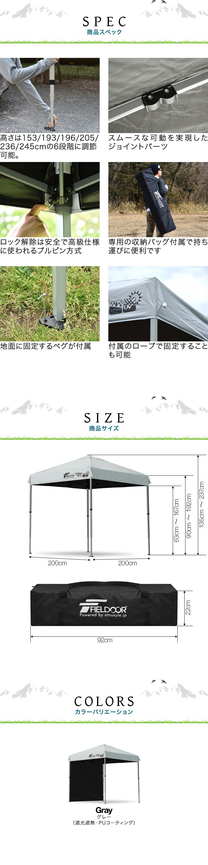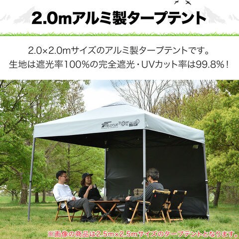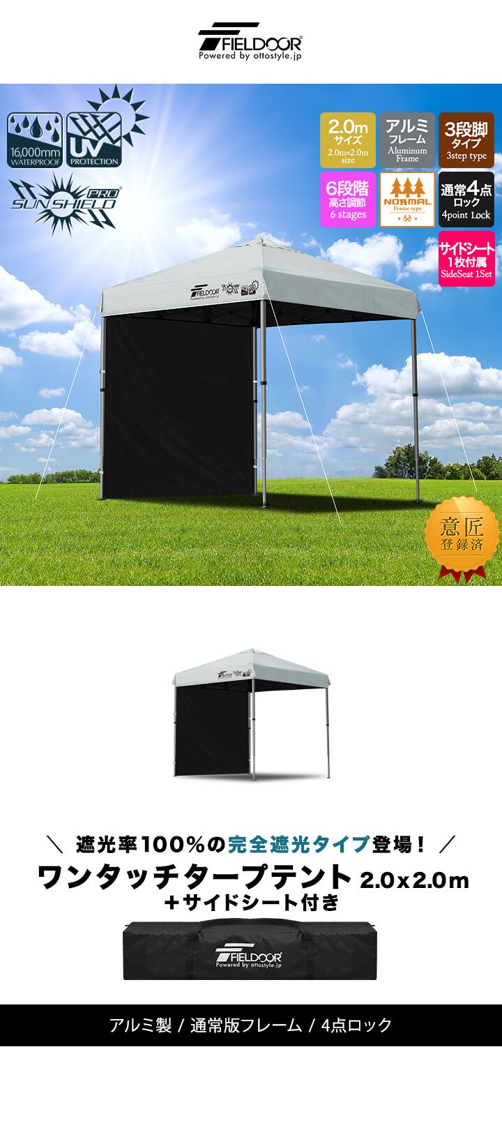 FIELDOOR ワンタッチタープテント 2m (遮光遮熱PU:グレー/アルミ/4点脚ロック//強化サポート/サイドシート1枚付) 軽量 テント タープ ワンタッチテント ワンタッチタープ UV加工 撥水 ベンチレーション 収納バッグ付 日よけ キャンプ バーベキュー 送料無料