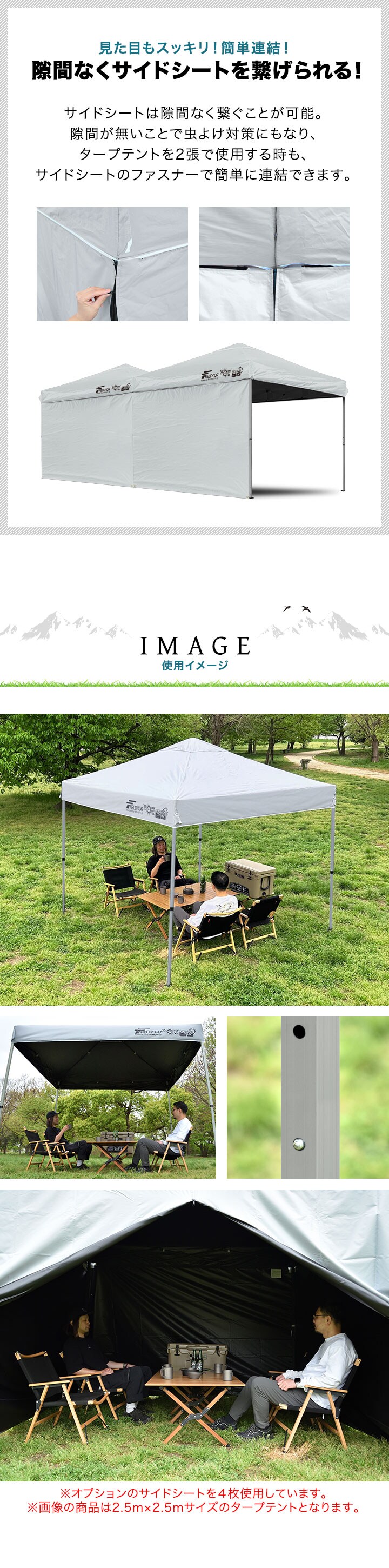 | 付属品: ・専用サイドシート(1枚) ・ロープ ・ペグ ・収納バッグ ・取扱説明書 |
