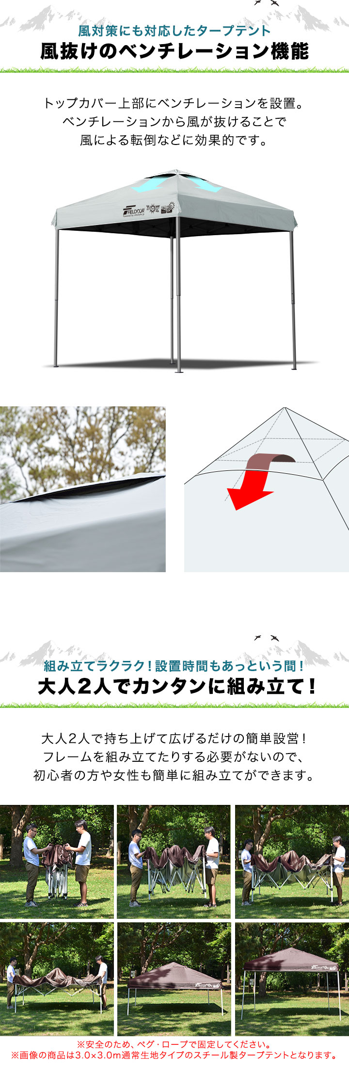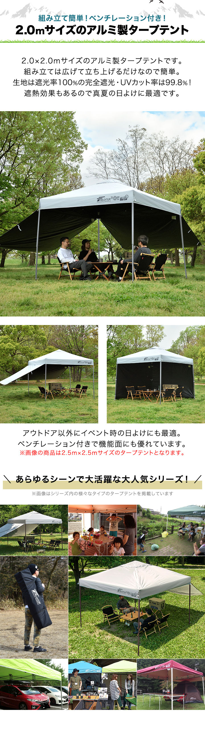 FIELDOOR ワンタッチタープテント 2m (遮光遮熱PU:グレー/アルミ/強化版サイドフレーム/4点脚ロック/強化サポート/サイドシート2枚付) 軽量 テント タープ ワンタッチテント ワンタッチタープ UV加工 撥水 ベンチレーション 収納バッグ付 日よけ キャンプ 送料無料