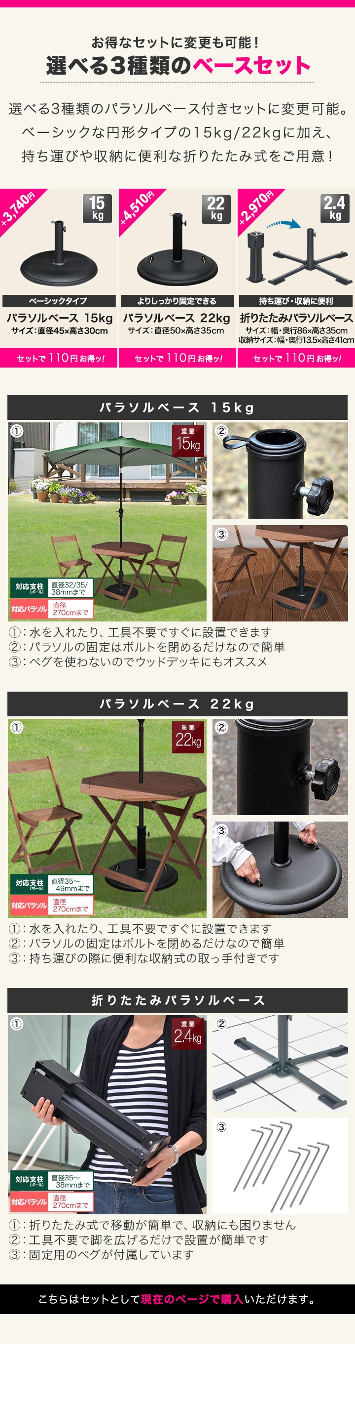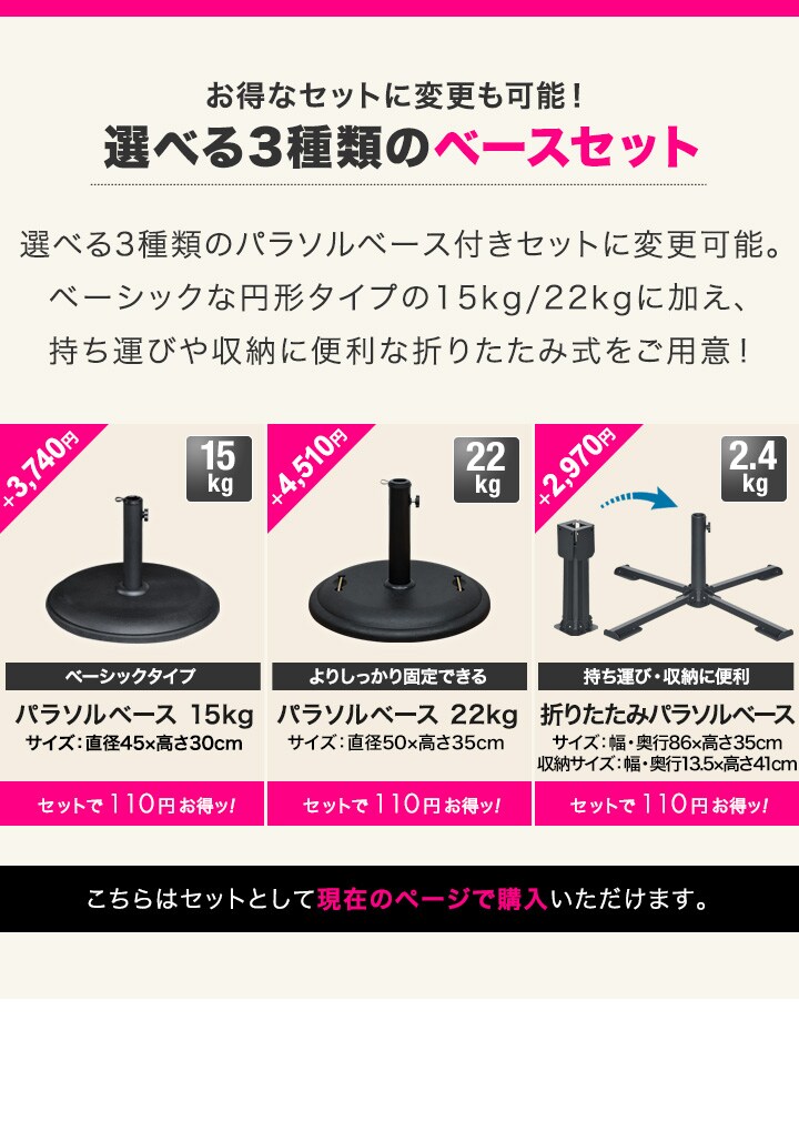 | 対応サイズ: ・支柱径35mm~38mm ・パラソル直径270cmまで |