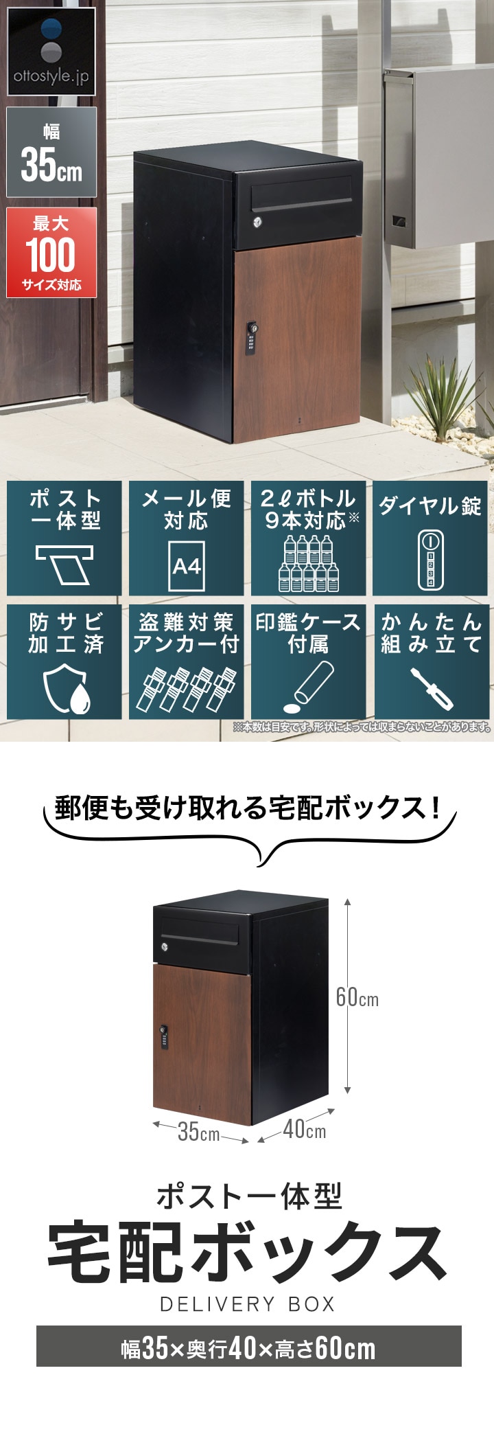 宅配ボックス 大容量 ポスト 一体型 宅配BOX 宅配便 100サイズ/A4 レターパック/メール対応 鍵付き ダイヤル錠 宅配ポスト 戸建て用 屋外 おしゃれ 木目 防水 置き配 盗難防止 スリム 幅35cm 大型 後付け 工事不要 ステッカー付き 送料無料
