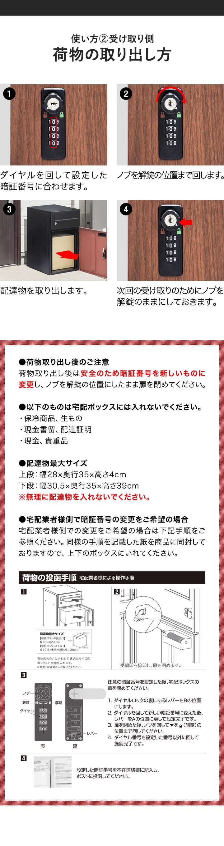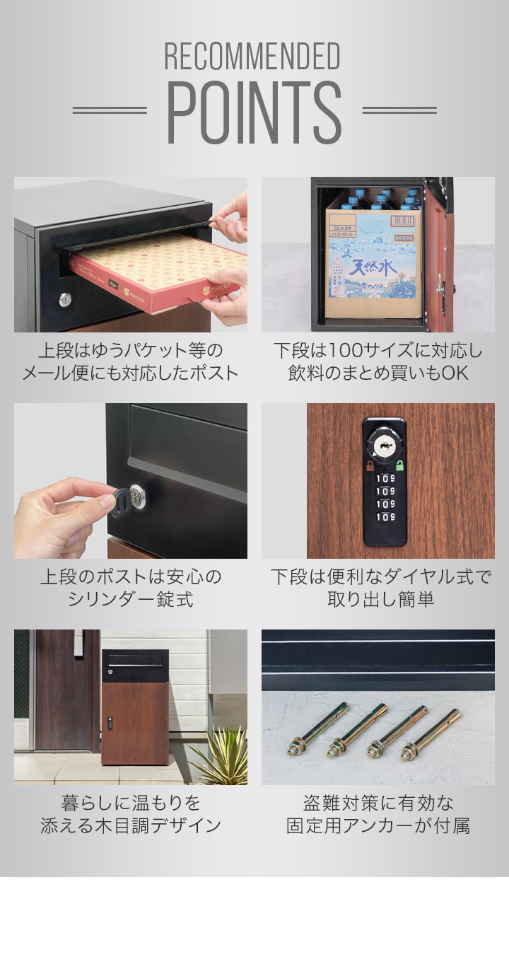 | 特記事項: ※こちらはお客様による組み立てが必要な商品です。 ※組み立てに必要な工具は付属しています。 ※組み立ての際は、電動ドライバーの使用を推奨します。お手持ちの電動ドライバーを使うことで、組み立て時間を短縮することができます。 ※アンカーの取り付け床面はコンクリートなどの強度のある床を前提としておりますので、それ以外の床面に取り付ける場合は工務店様等へお問い合わせください。取り付け部の強度が不足している場合は倒れる原因になります。 ※以下のものは宅配ボックスには入れないでください。 ・保冷商品、生もの ・現金書留、配達証明 ・現金、貴重品 ※本製品は防水塗装を施しておりますが完全防水ではございません。より永くご愛用いただくために屋根のある場所への設置を推奨いたします。 ※安全のため本製品を使用するたびに暗証番号を新しいものに変更することを推奨いたします。 ※佐川急便はSGホールディングス株式会社の登録商標です。 ※ヤマト運輸はヤマトホールディングス株式会社の登録商標です。 ※日本郵便は日本郵政株式会社の登録商標です。 |