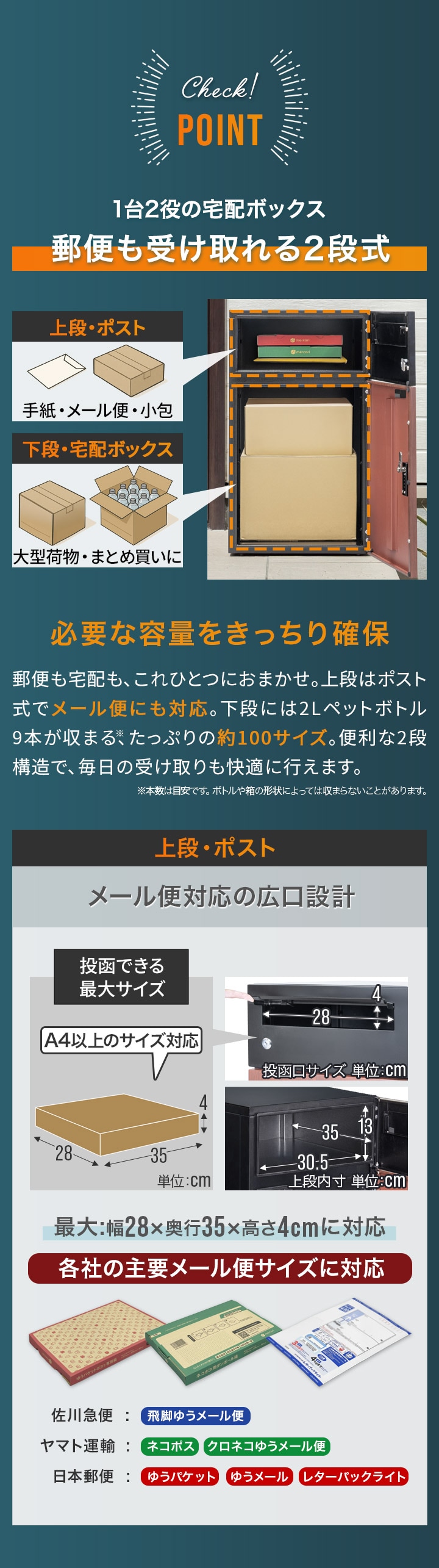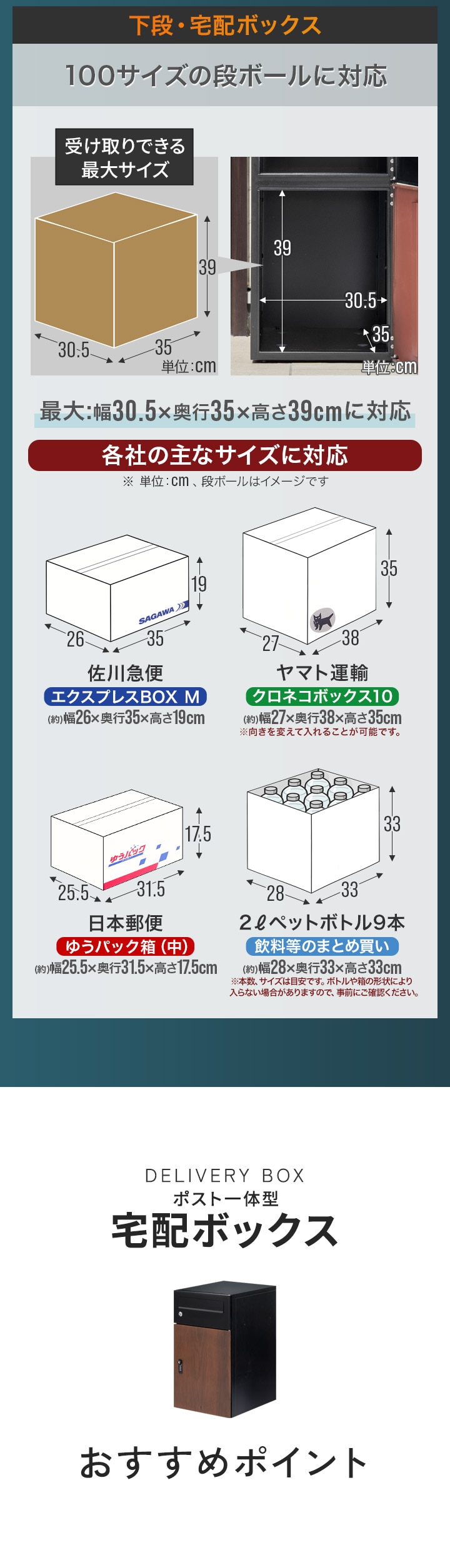 | 配達物最大サイズ: ・上段ポスト:(約)幅28cm×奥行35cm×高さ4cm ・下段宅配ボックス:(約)幅30.5cm×奥行35cm×高さ39cm |