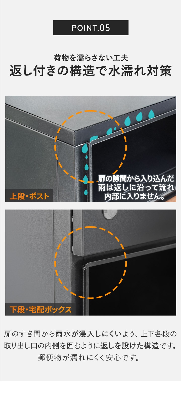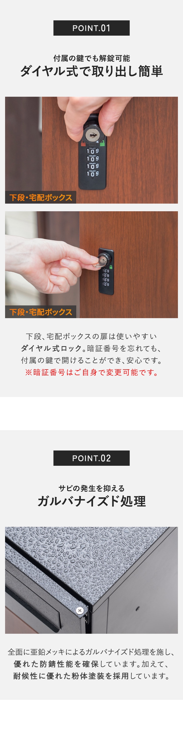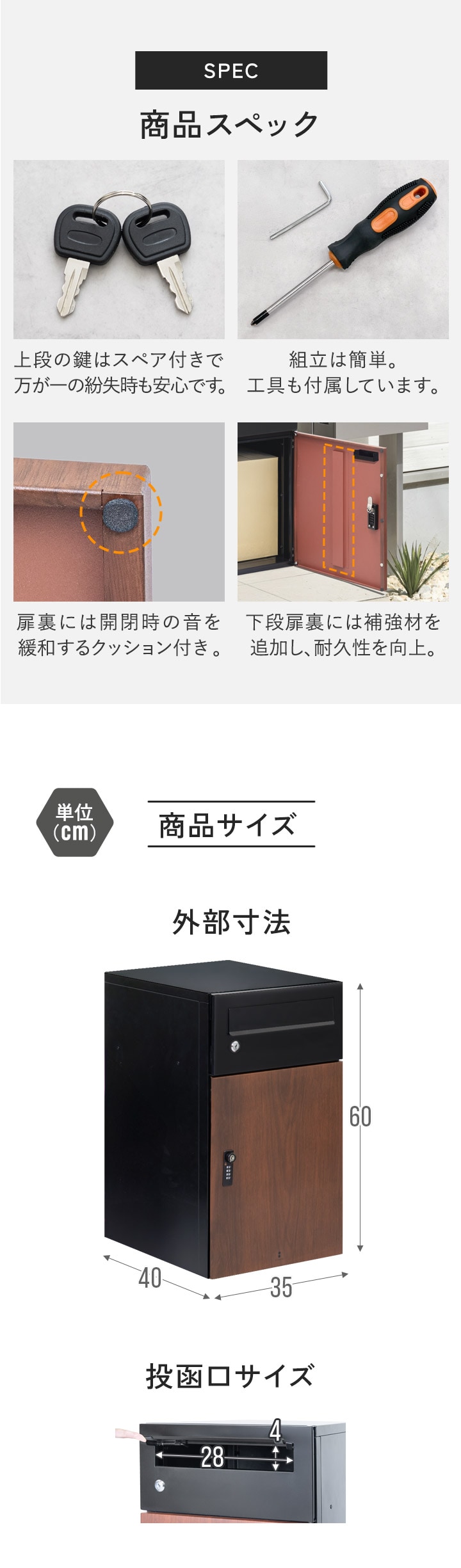 | 付属品: 鍵(ポスト用)×2、鍵(宅配ボックス用)×1、印鑑トレイ×1、アンカープラグ×4、シール(1)×1、シール(2)×2、ドライバー×1、六角レンチ×1 |