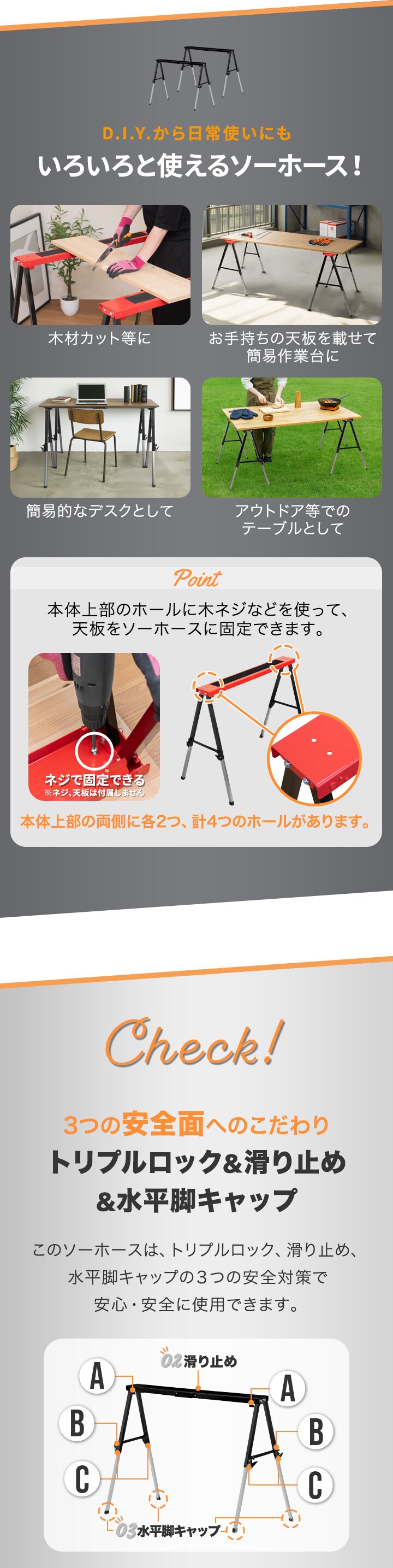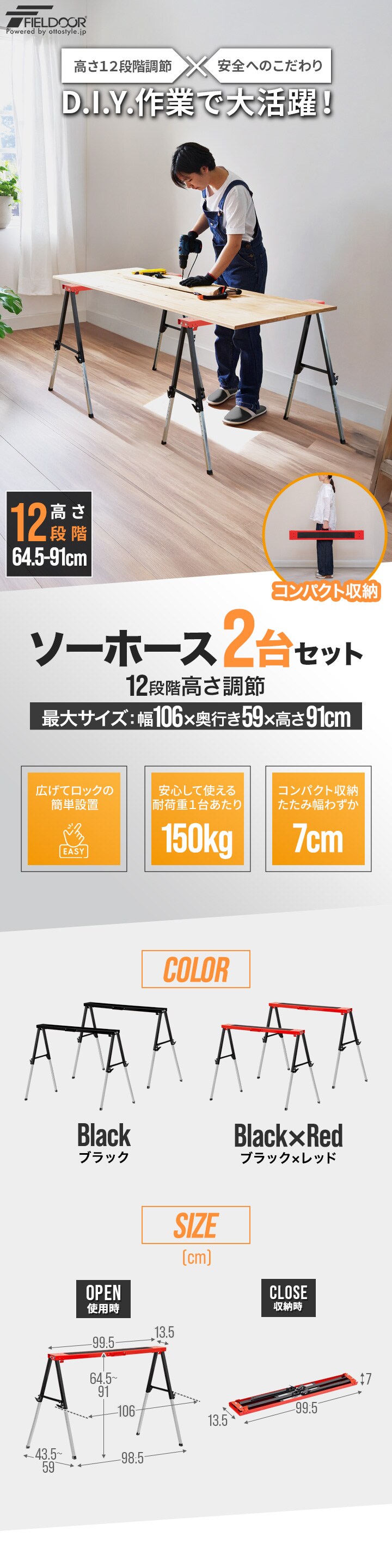 FIELDOOR ソーホース 作業台 (ブラック) 2台セット 折りたたみ 幅116cm 高さ調整 12段階 64.5cm~91cm 耐荷重150kg メタル スチール製 馬脚 DIY 日曜大工 木工 簡易作業台 工作台 作業馬 作業机 デスク ワークテーブル テーブル脚 2本組 ※脚のみ 送料無料
