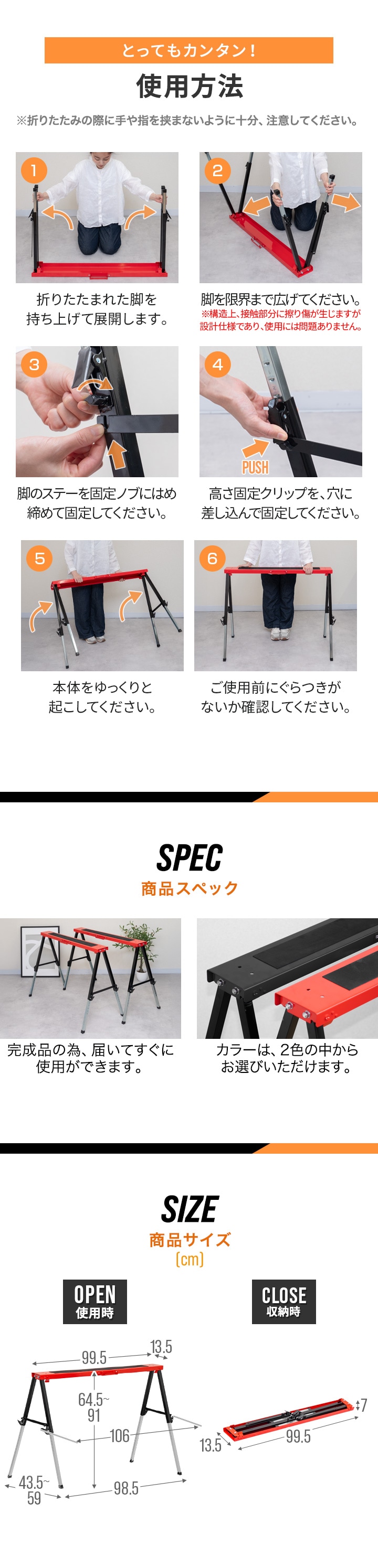 | サイズ: 使用時 : (約)幅99.5cm×奥行43.5cm×高さ64.5~91cm ※1台のサイズ ※最大高さ91cmまで脚フレームを伸ばした際の奥行きは59cmとなります。 収納時 : (約)幅99.5cm×奥行13.5cm×高さ7cm ※1台のサイズ |