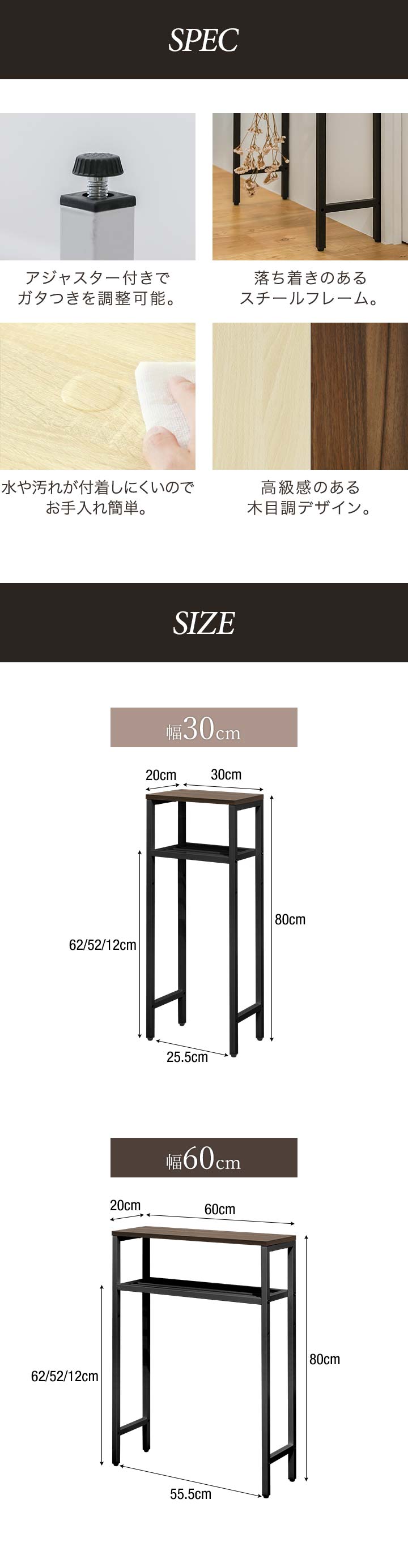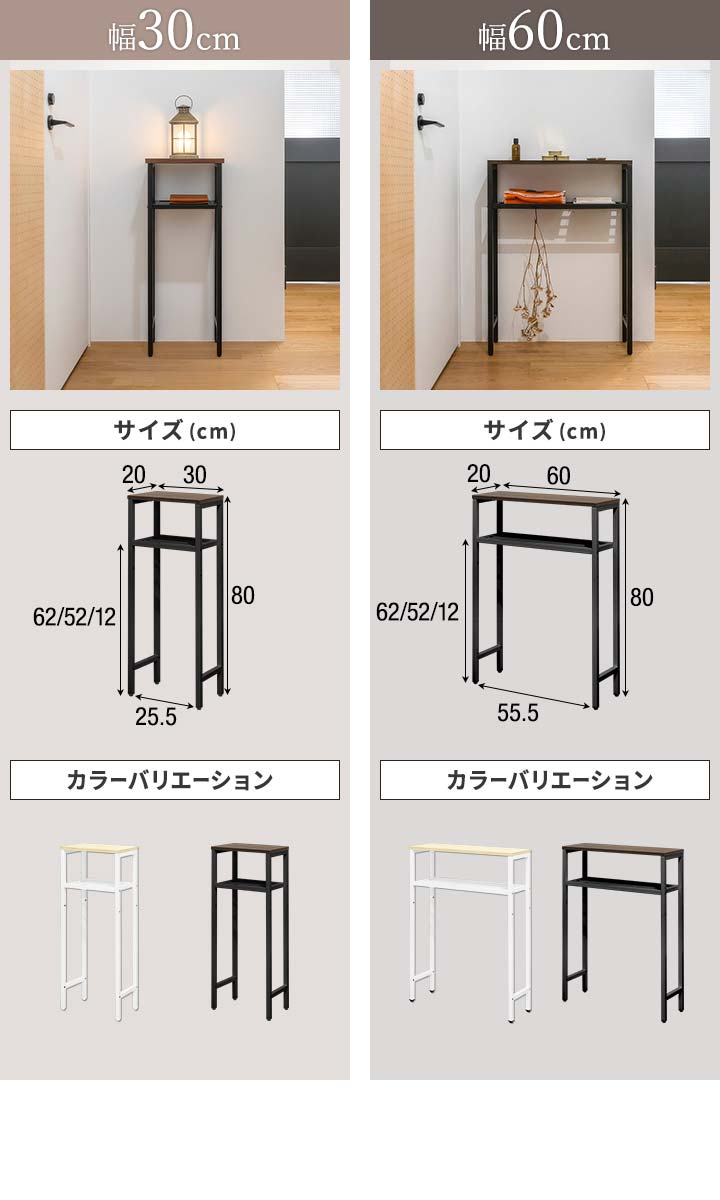 | サイズ: 【幅30cm】 (約)幅30cm×奥行20cm×高さ80cm ※棚高さ3段階 62/52/12cm 【幅60cm】 (約)幅60cm×奥行20cm×高さ80cm ※棚高さ3段階 62/52/12cm |