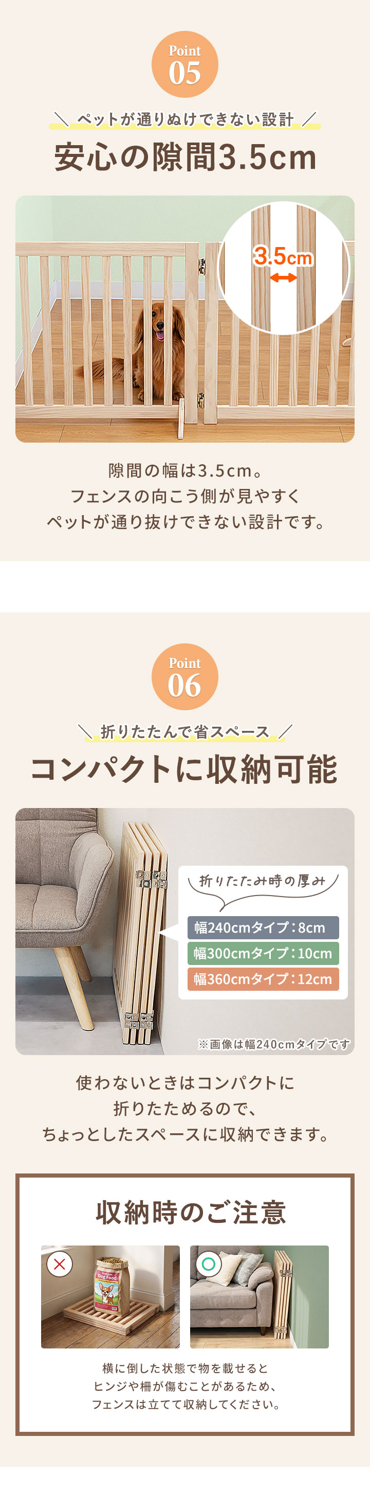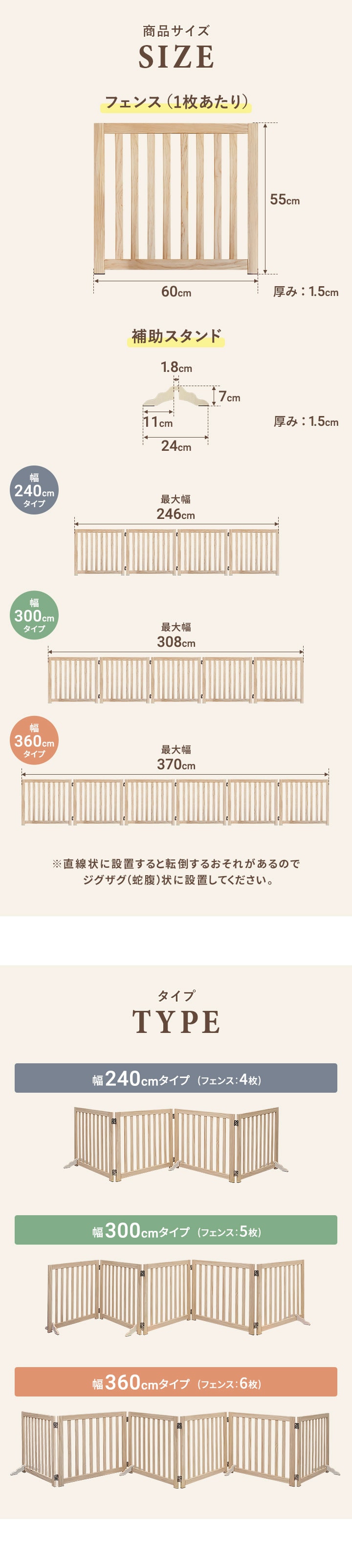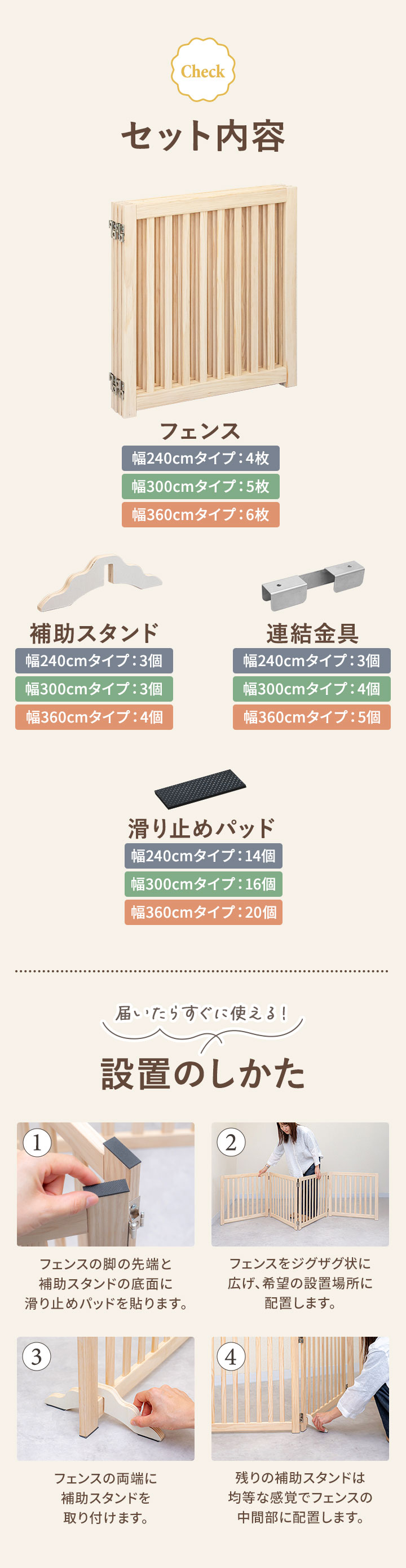 | セット内容: 【幅240cmタイプ】 ・フェンス×4枚、補助スタンド×3個、連結金具×3個、滑り止めパッド×14枚 【幅300cmタイプ】 ・フェンス×5枚、補助スタンド×3個、連結金具×4個、滑り止めパッド×16枚 【幅360cmタイプ】 ・フェンス×6枚、補助スタンド×4個、連結金具×5個、滑り止めパッド×20枚 |