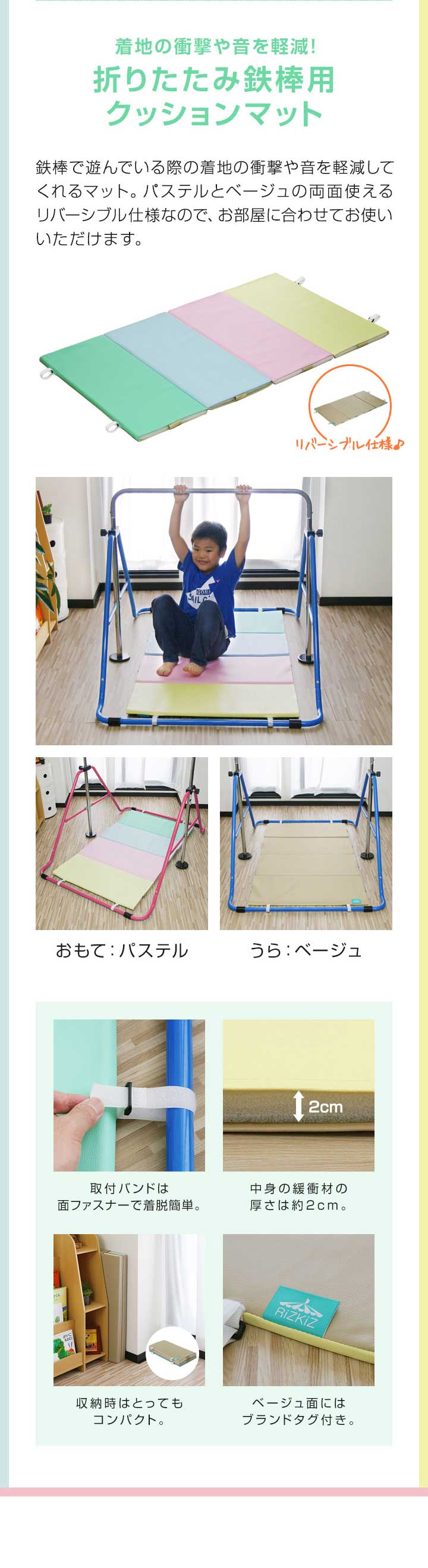 RiZKiZ 鉄棒 (グレージュ/クッションマット付きセット) 室内 子供 耐荷重100kg 折りたたみ鉄棒 安全 SGマーク 家庭用 トレーニング 子ども 3才~ 逆上がり ぶら下がり てつぼう 折り畳み 男の子 女の子 保育園 幼稚園 小学校 室内遊具 運動 体育 練習 送料無料