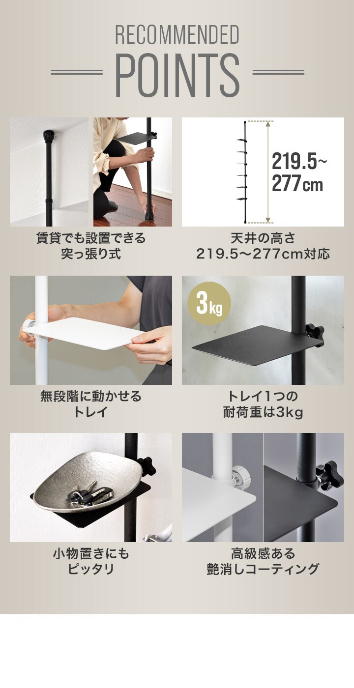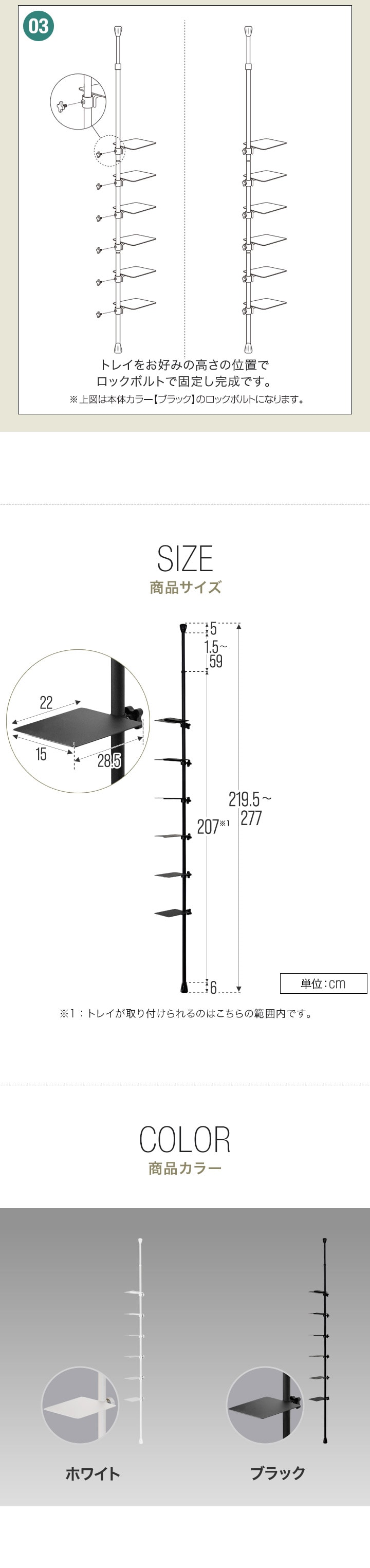 | サイズ: (約)幅15cm×奥行28.5cm×高さ219.5~277cm(トレイを含む最大サイズ) |