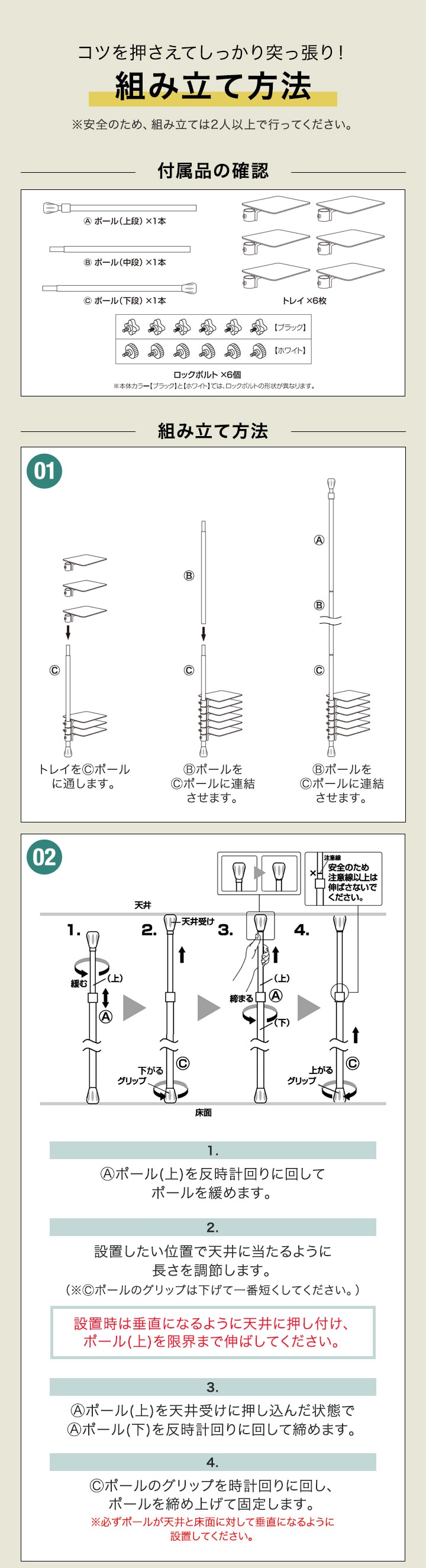| セット内容: ・突っ張り式ポール×1本 ・トレイ×6枚 ・ロックボルト×6個 |
