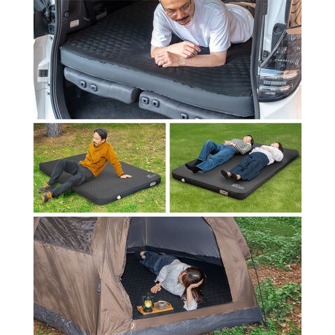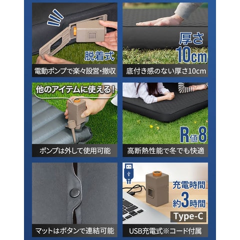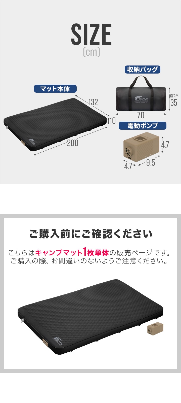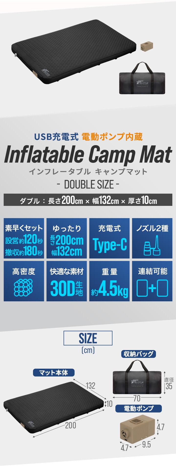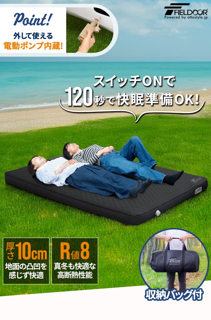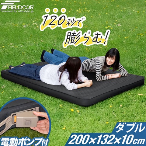 FIELDOOR キャンプ マット (ダブル幅132cm/単品/マット本体のみ) 極厚 厚さ10cm インフレーターマット エアーマット 電動ポンプ付き 断熱 車中泊 テント アウトドア用寝具 コンパクト収納 自動膨張 エアーベッド 吸引 連結 厚手 防災 送料無料