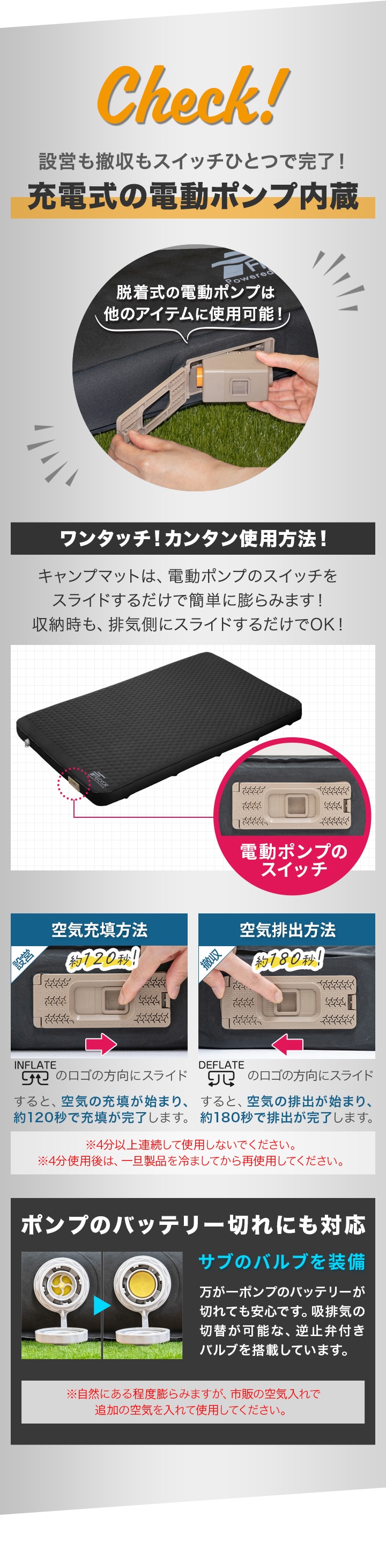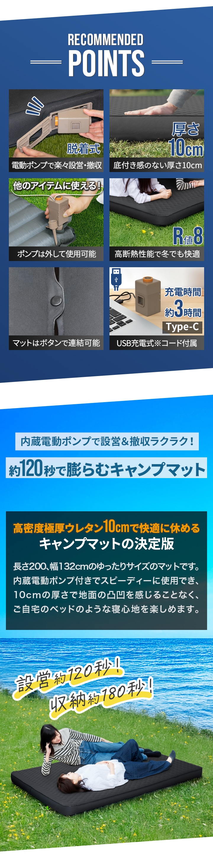 | セット内容: 本体マット×1 収納バッグ×1 収納バンド×2 電動ポンプ×1 ノズル(2種類)×1 充電用USBケーブル(Type-C)×1 日本語説明書×1 |