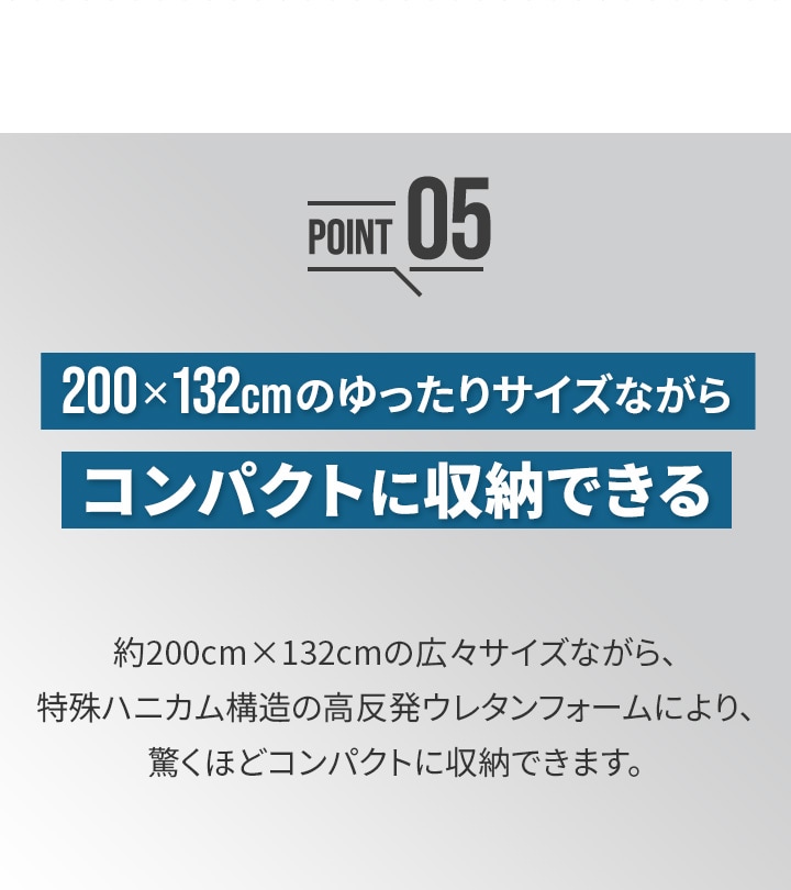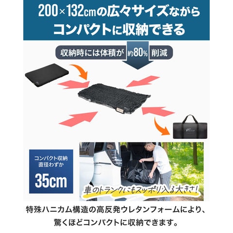 | 本体マットサイズ: ・使用時:(約)幅132cm×奥行き200cm×高さ10cm ・収納時:(約)直径35cm×奥行き70cm |
