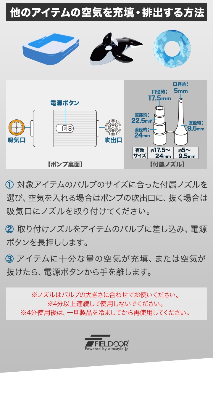 | 電動ポンプノズル径: 小:(約)5-9.5mm/大:(約)17.5-24mm |