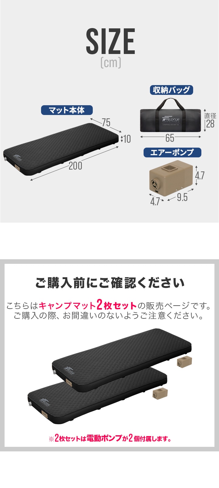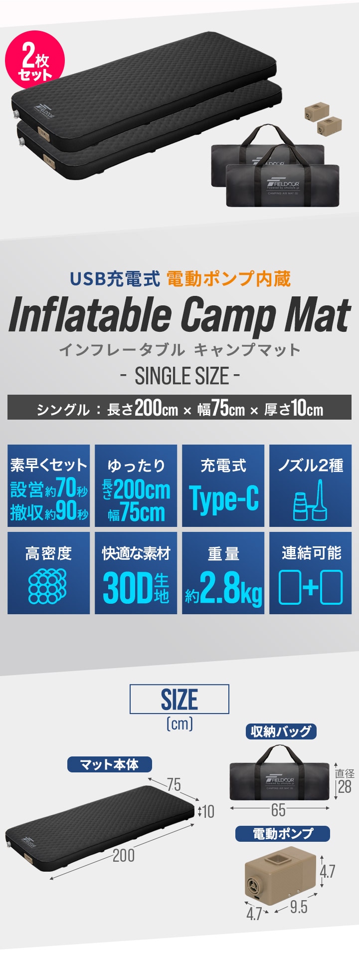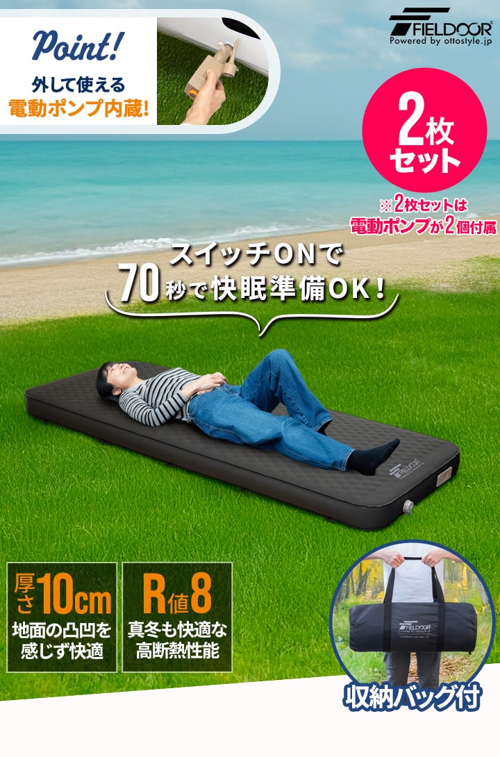 FIELDOOR キャンプ マット (シングル幅75cm/お買得2個セット/マット本体のみ) 極厚 厚さ10cm インフレーターマット エアーマット 電動ポンプ付き 断熱 車中泊 テント アウトドア用寝具 コンパクト収納 自動膨張 エアーベッド 吸引 連結 厚手 防災 送料無料