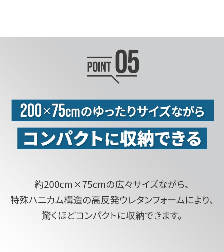 | 本体マットサイズ: ・使用時:(約)幅75cm×奥行き200cm×高さ10cm ・収納時:(約)直径28cm×奥行き65cm |