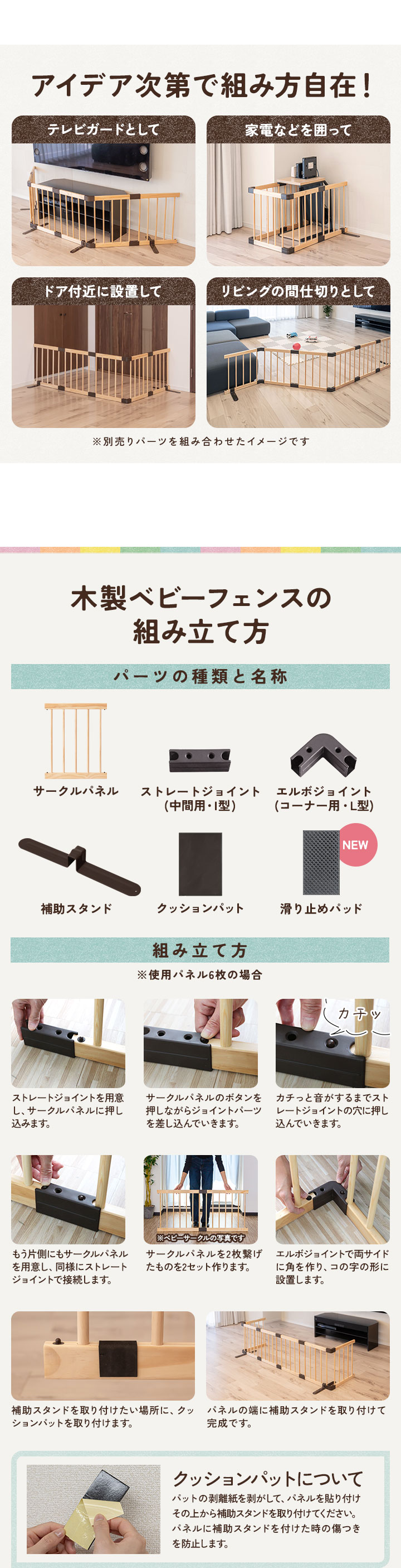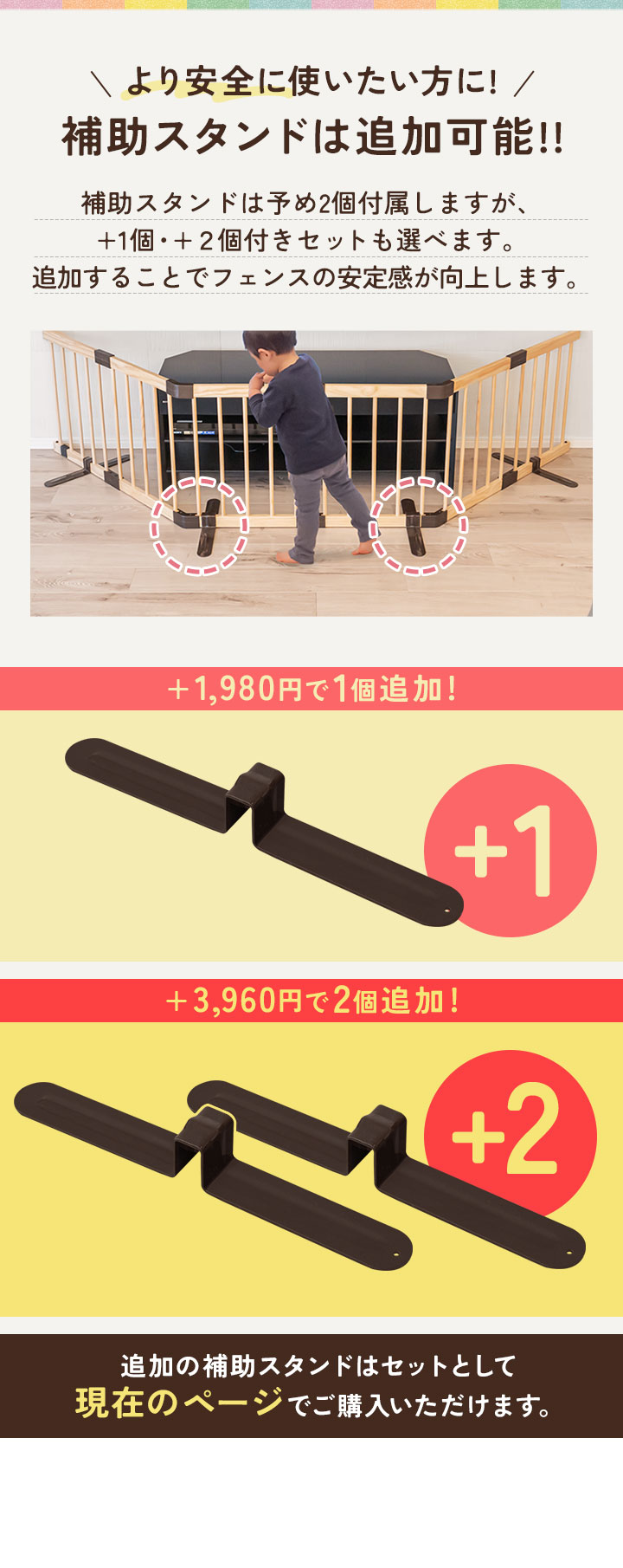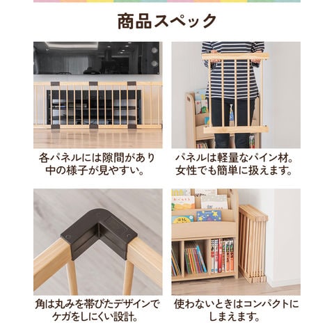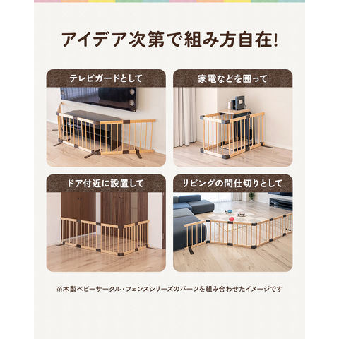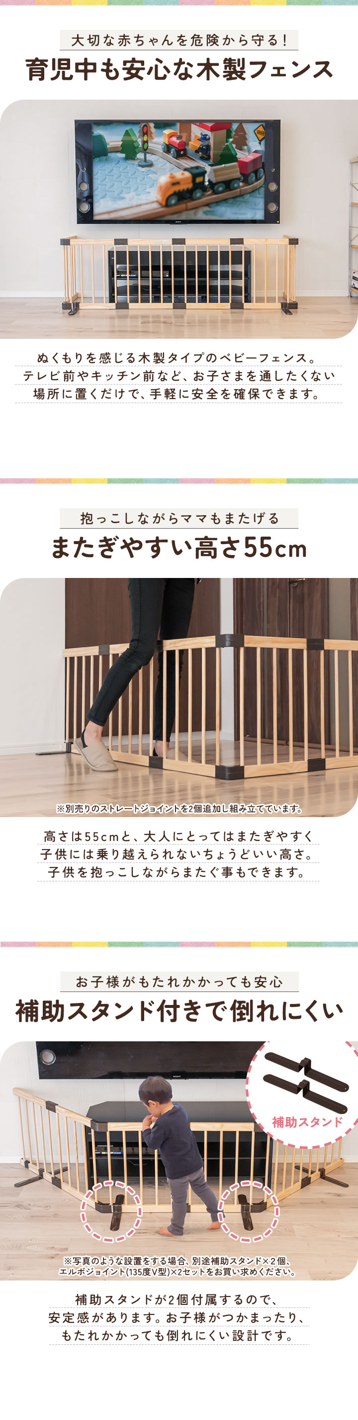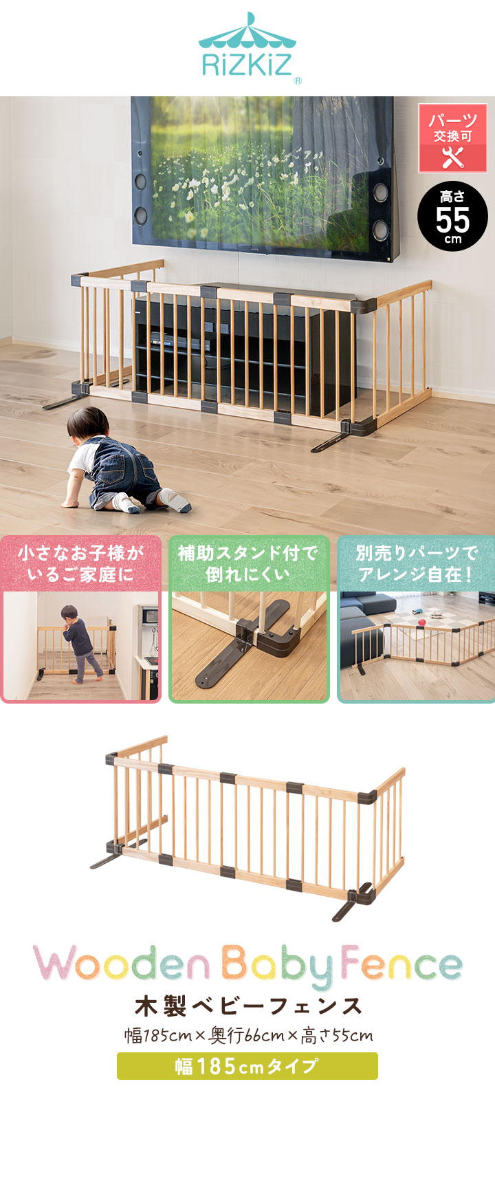 RiZKiZ ベビーフェンス (幅185cm/ドアなし/補助スタンド2+2本セット) 高さ55cm 木製 置くだけ 幅約45cm 自立式 補助スタンド付き 天然木 簡単設置 組み立て式 テレビガード 階段 台所 キッチン リビング パーテーション ベビーサークル 柵 安全 倒れにくい 送料無料