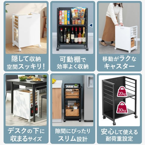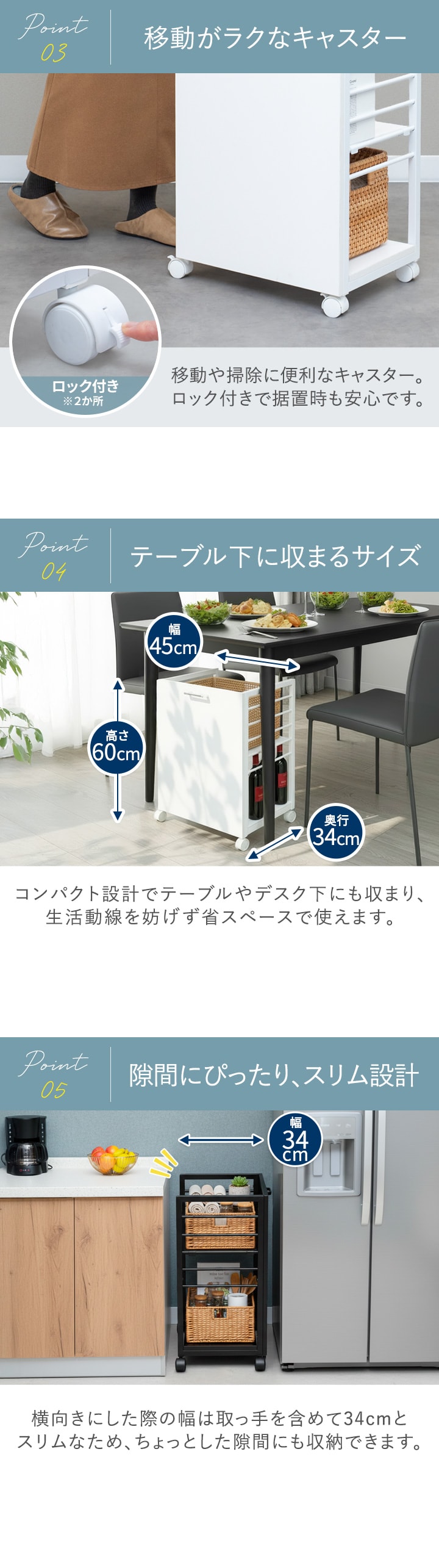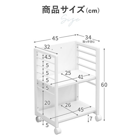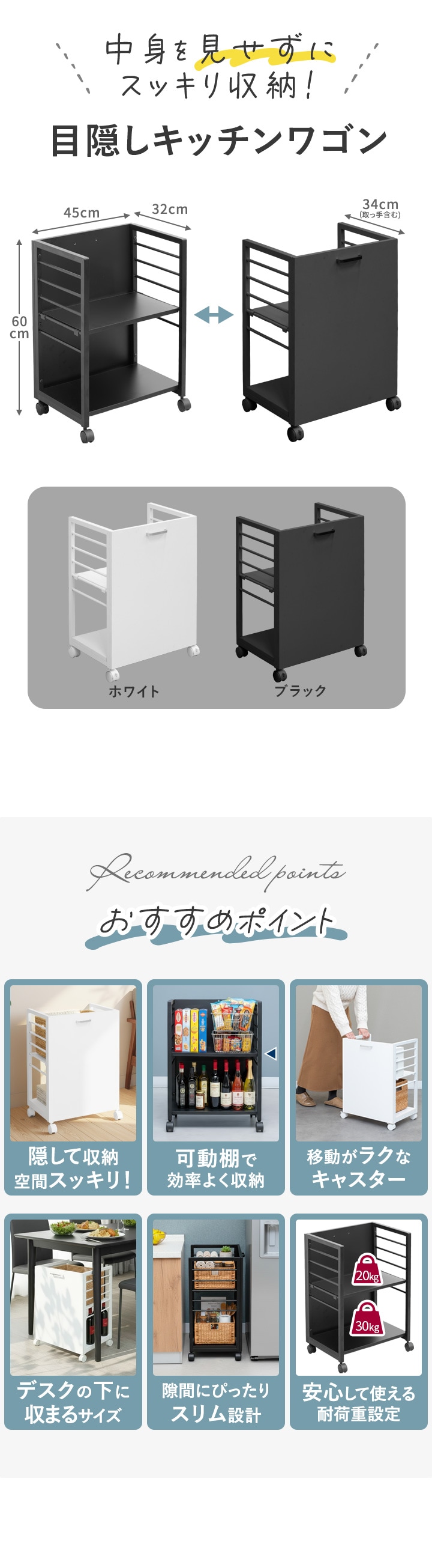 キッチンワゴン キャスター付き (ホワイト) 目隠しワゴン 高さ60cm スリム 幅45cm×34cm キッチン収納 キッチンラック 隙間収納ワゴン 可動棚 目隠し 見せない スチール 耐荷重50kg デスクワゴン サイドワゴン おしゃれ 北欧 送料無料